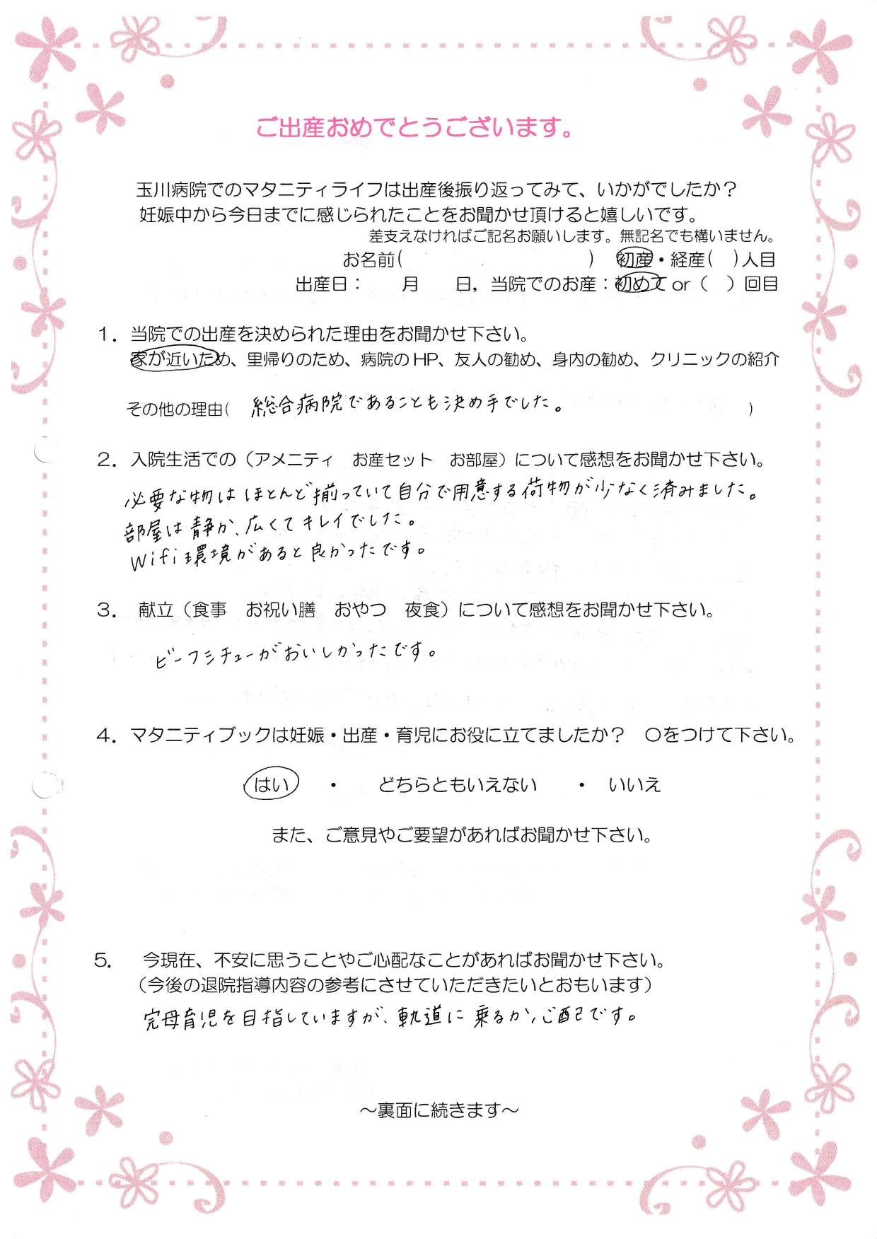 【1】家が近いため 総合病院であることも決め手でした。
