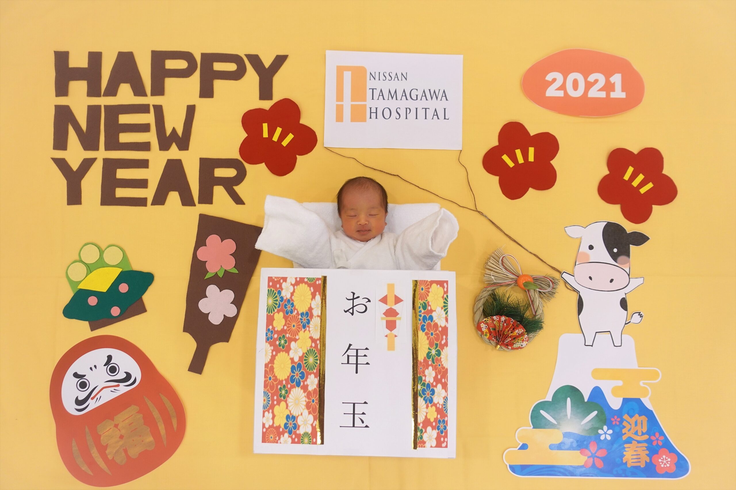 玉川病院産科棟では、昨年末から年始にかけてお正月をテーマにしたおひるねアートを撮影しました。丑年は「これから発展する前触れ(芽が出る)」とも言われる年です。赤ちゃんとご家族のみなさまが幸せでありますように。