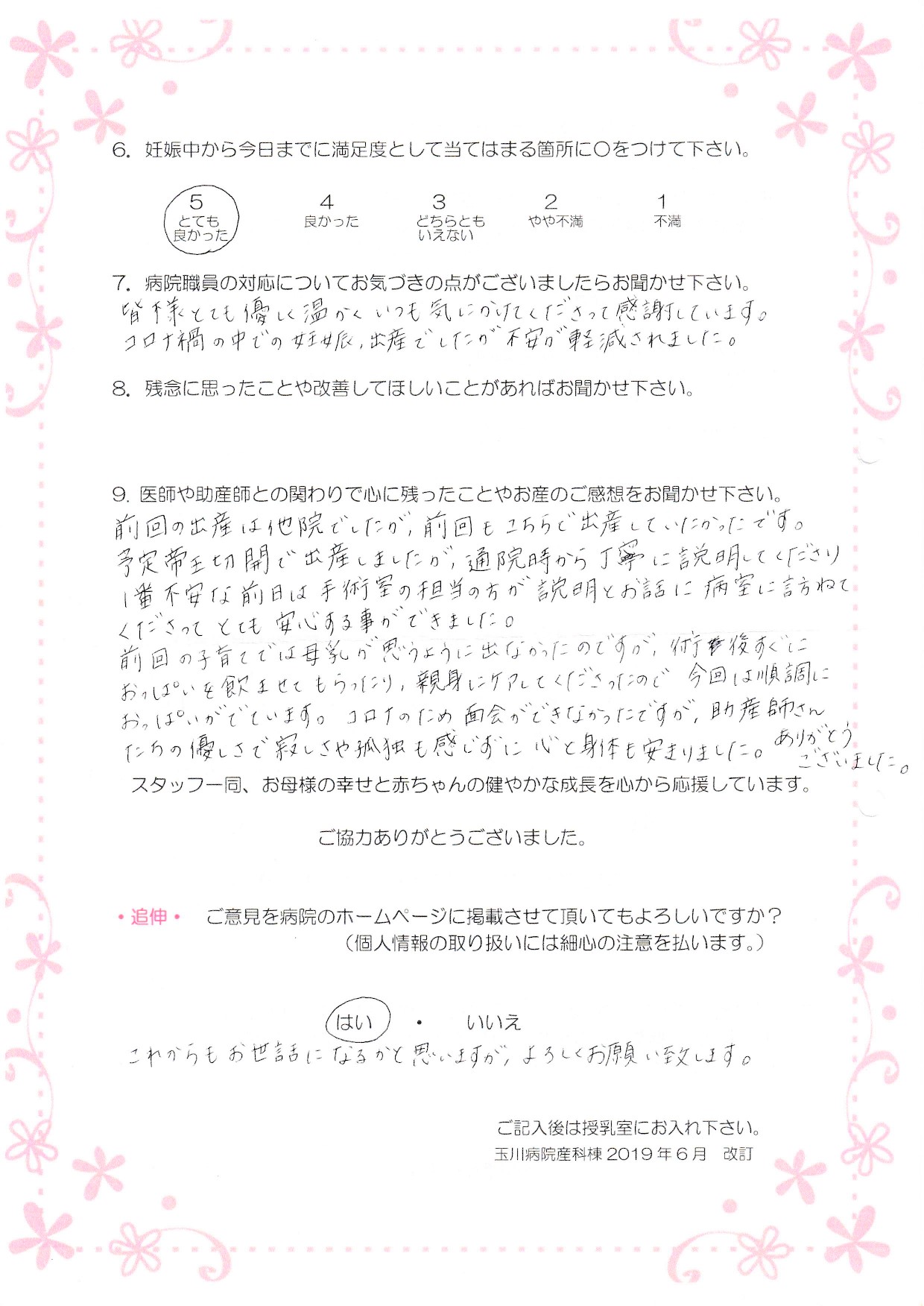 前回の子育てでは母乳が思うように出なかったのですが、術後すぐにおっぱいを飲ませてもらったり、親身にケアしてくださったので、今回は順調におっぱいが出ています。コロナのため面会ができなかったですが、助産師さんたちの優しさで寂しさや孤独も感じずに心と身体も休まりました。ありがとうございました。
