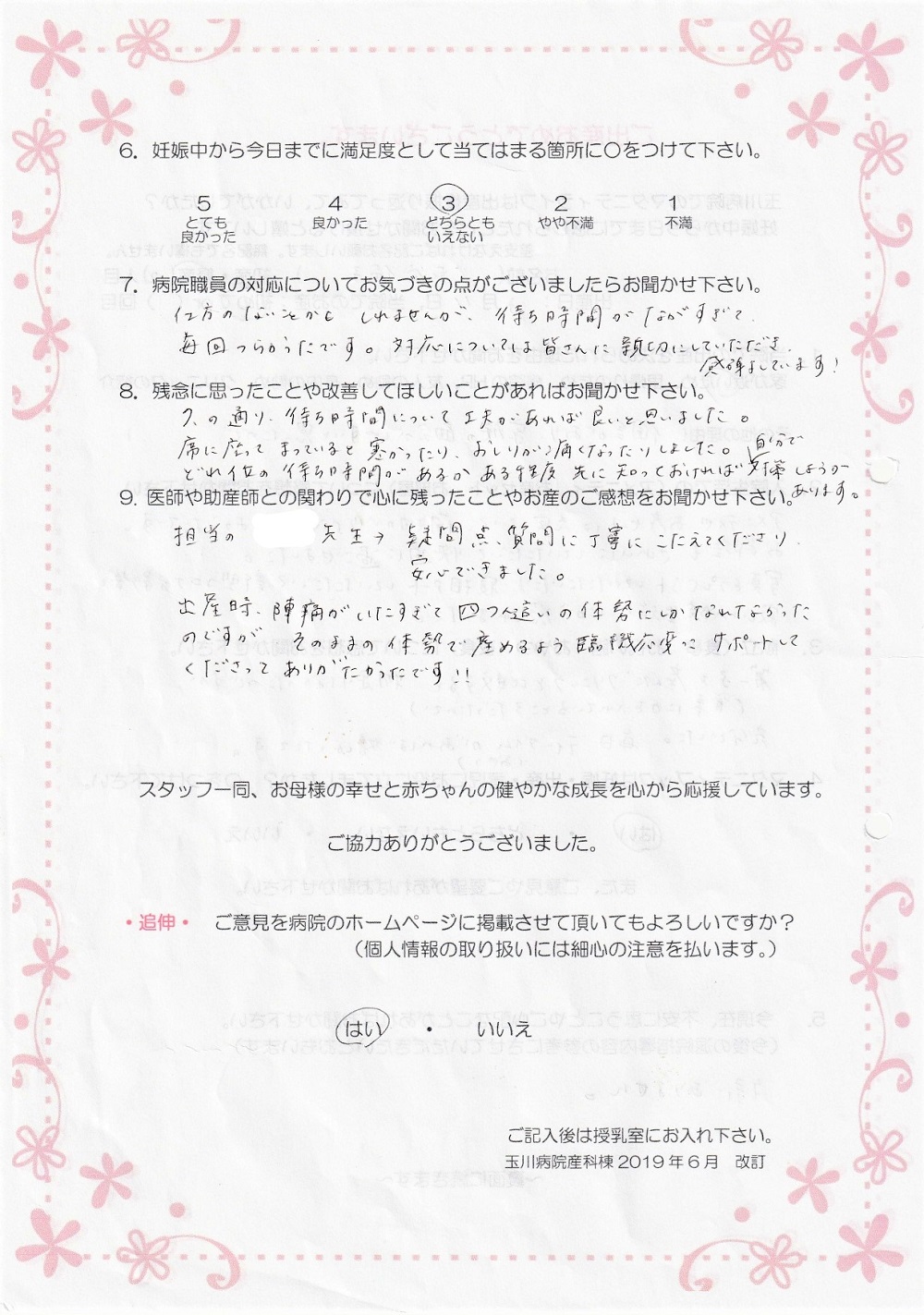 【9】 担当の○○先生→疑問点、質問に丁寧にこたえてくださり、安心出来ました。出産時、陣痛がいたすぎて四つん這いの体勢にしかなれなかったのですが、そのままの体勢で産めるよう臨機応変にサポートしてくださってありがたかったです!!