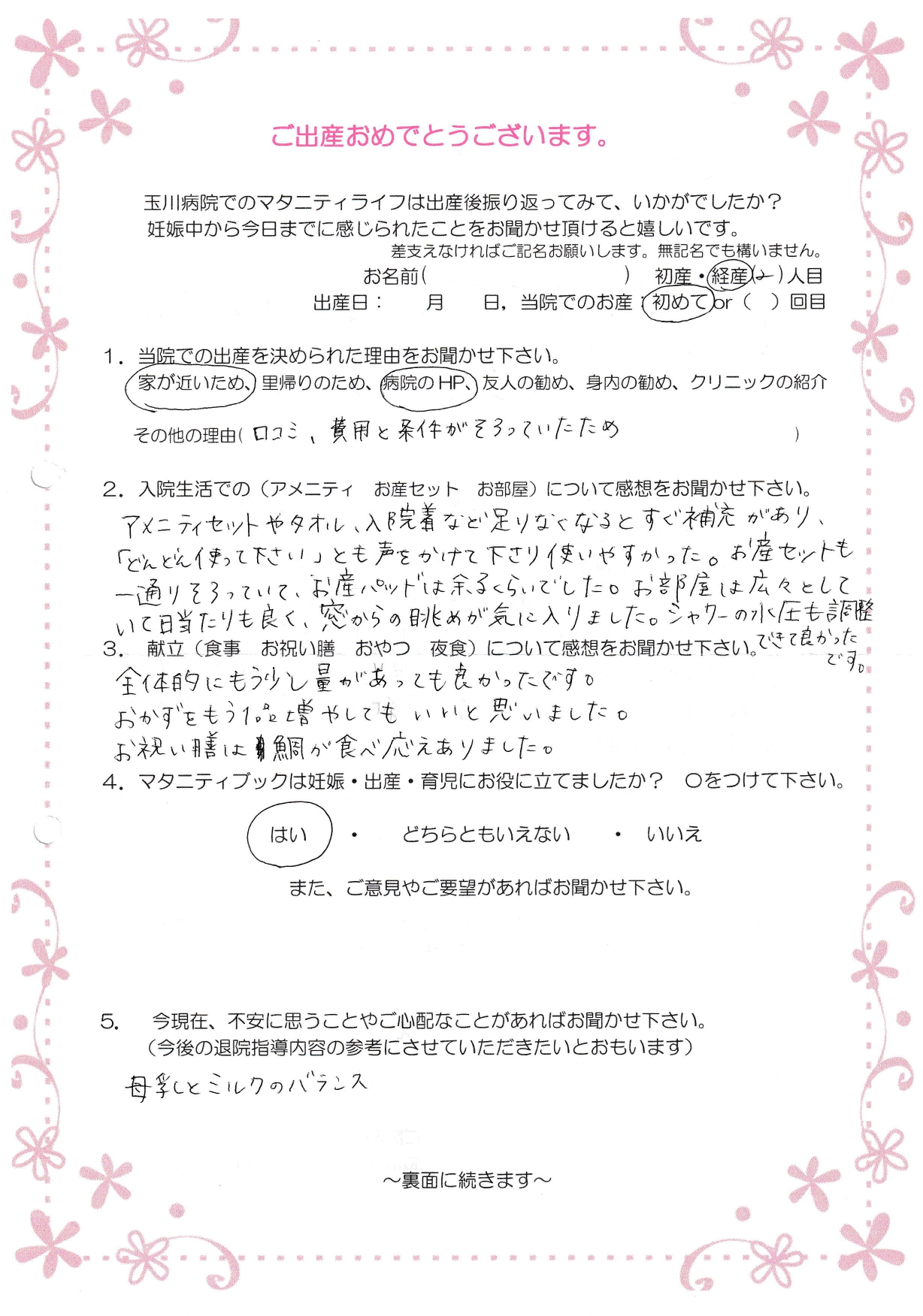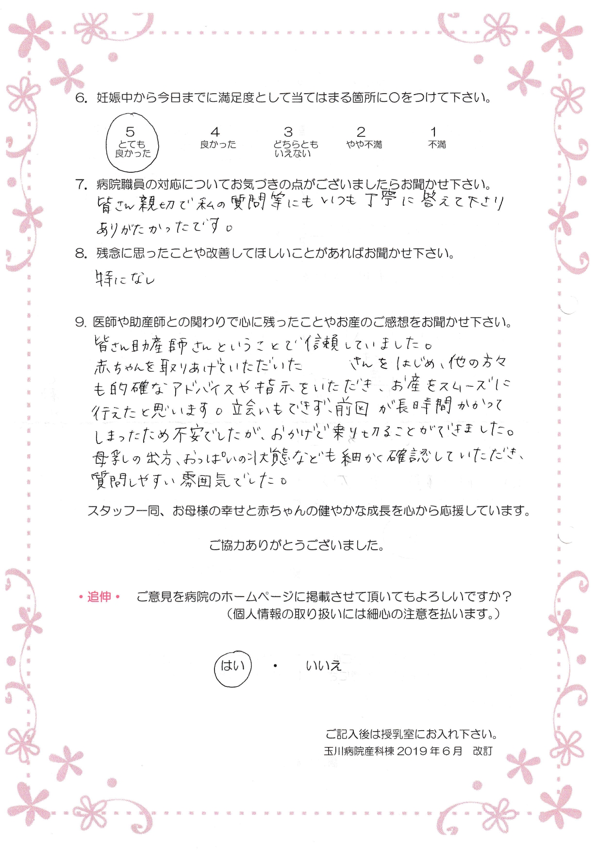 【9】 皆さん助産師さんということで信頼していました。赤ちゃんを取りあげていただいた助産師さんをはじめ、他の方々も的確なアドバイスや指示をいただき、お産をスムーズに行えたと思います。立会いもできず、前回が長時間かかってしまったため不安でしたが、おかげで乗り切ることができました。母乳の出方、おっぱいの状態なども細かく確認していただき、質問しやすい雰囲気でした。
