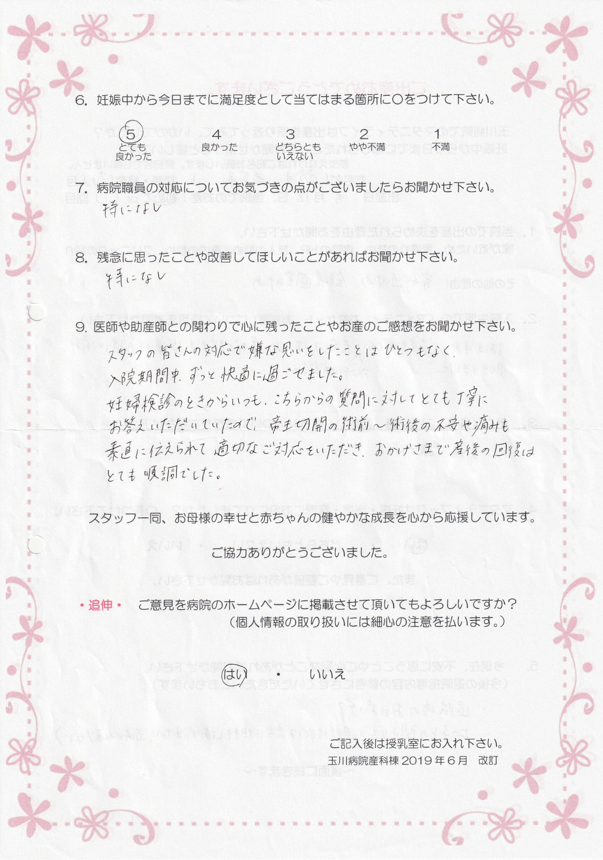 【9】スタッフの皆さんの対応で嫌な思いをしたことはひとつもなく、入院期間中、ずっと快適に過ごせました。妊婦検診のときからいつも、こちらからの質問に対してとても丁寧にお答えいただいていたので、帝王切開の術前~術後の不安や痛みも素直に伝えられて適切なご対応をいただき、おかげさまで産後の回復はとても順調でした。