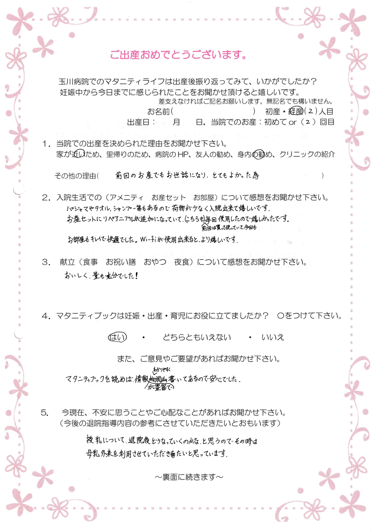 【1】 家が近いため、前回のお産でもお世話になり、とてもよかった為