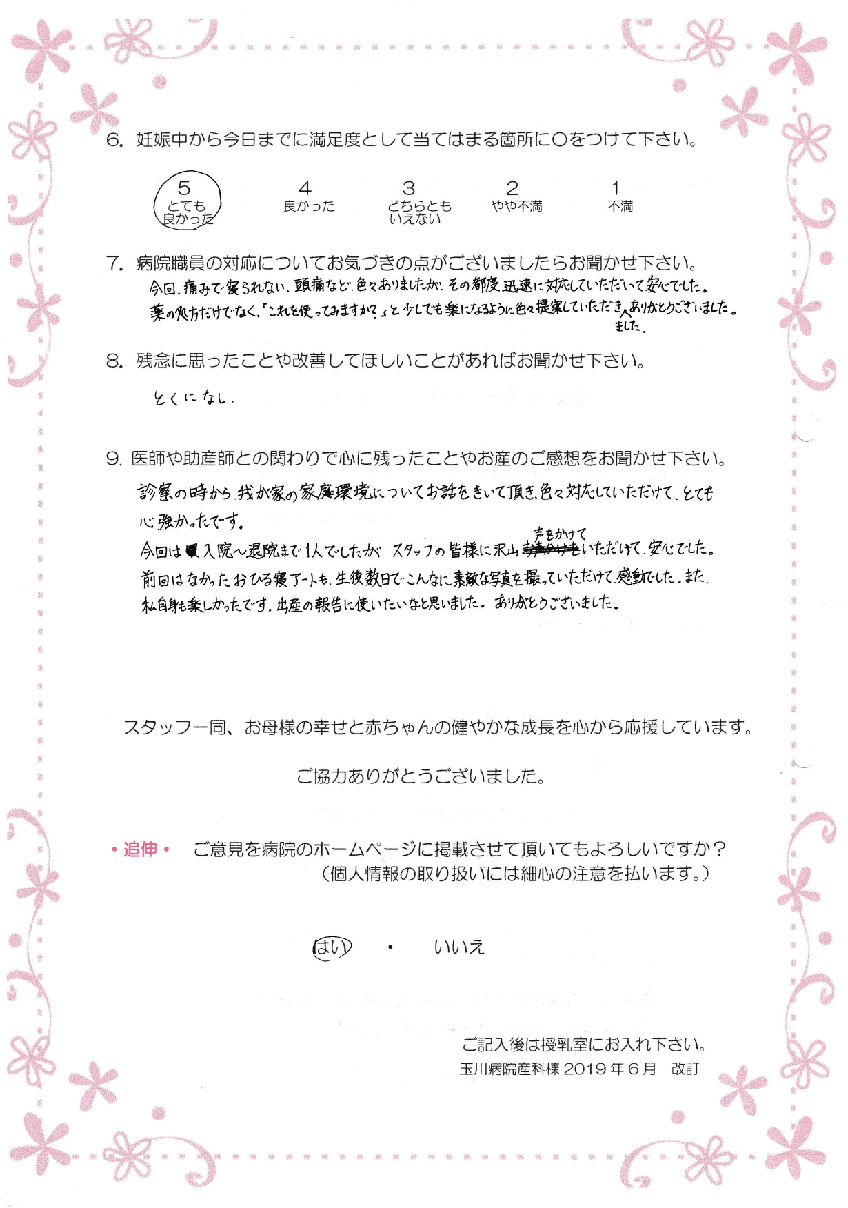 【5】授乳について、退院後どうなっていくのかな、と思うのでその時は母乳外来を利用させていただきたいと思っています。