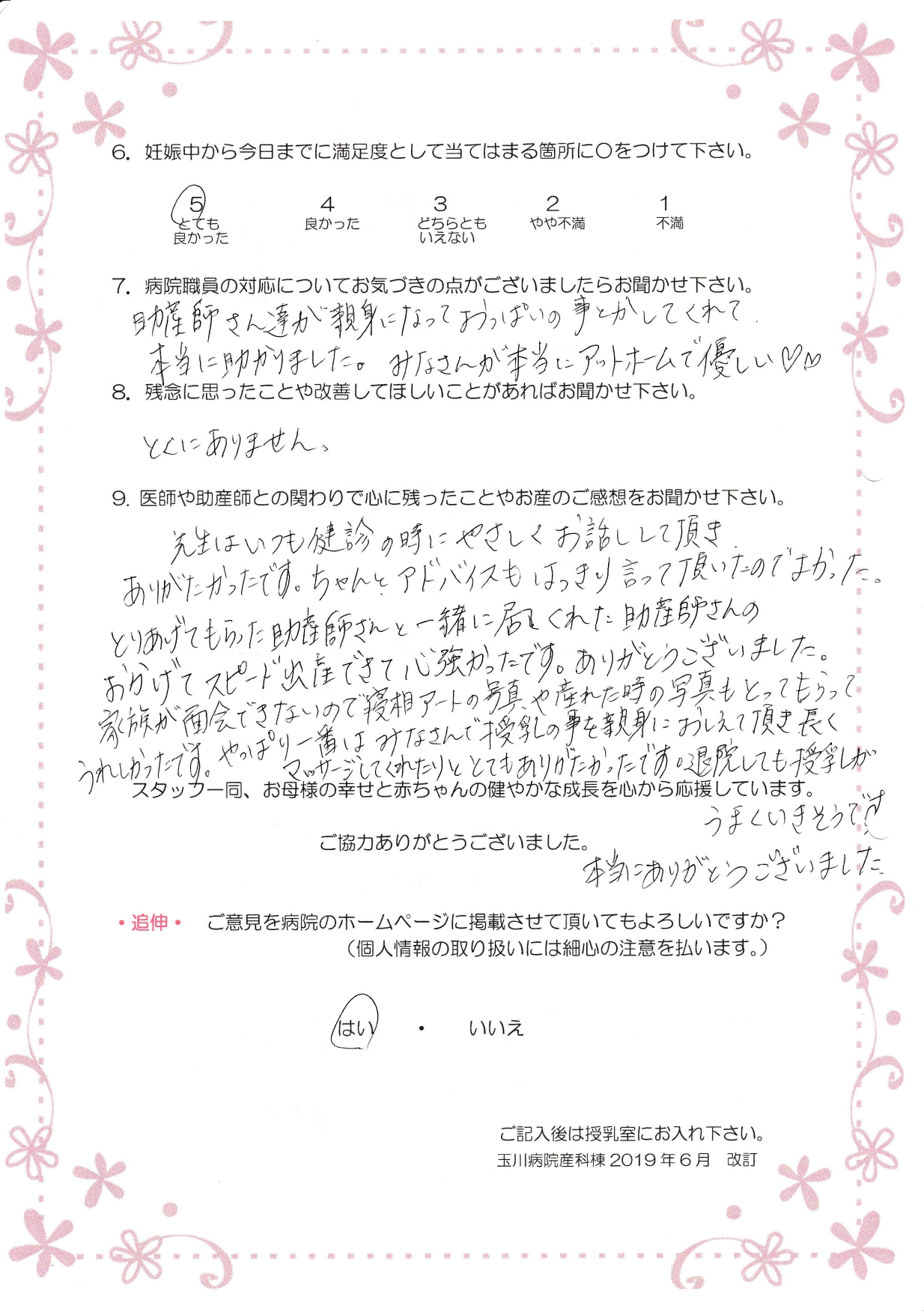 【9】先生はいつも健診の時にやさしくお話して頂き、ありがたかったです。ちゃんとアドバイスもはっきり言って頂いたのでよかった。とりあげてもらった助産師さんと一緒に居てくれた助産師さんのおかげでスピード出産できて心強かったです。ありがとうございました。家族が面会できないので寝相アートの写真や産れた時の写真をとってもらってうれしかったです。やっぱり一番はみなさんで授乳の事を親身におしえて頂き、長くマッサージしてくれてたりととてもありがたかったです。退院しても授乳がうまくいきそうです。本当にありがとうございました。