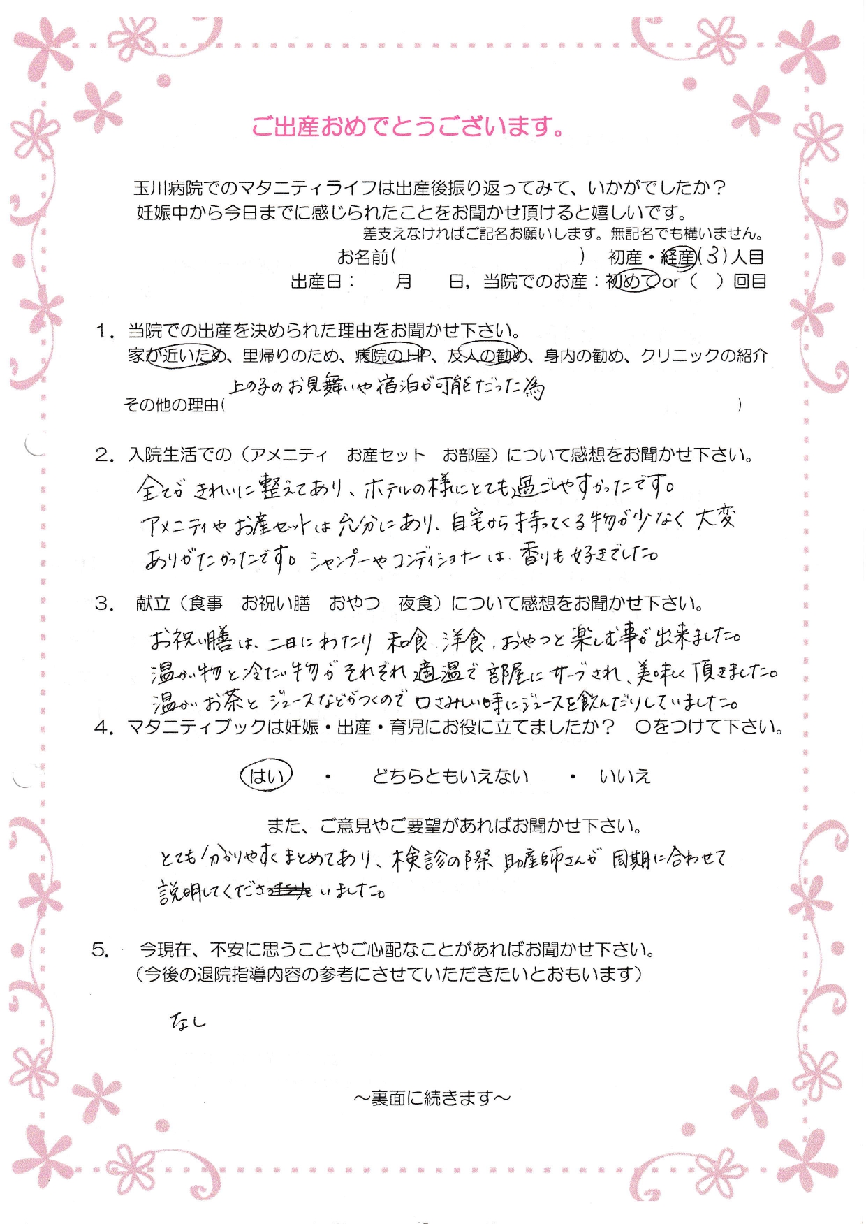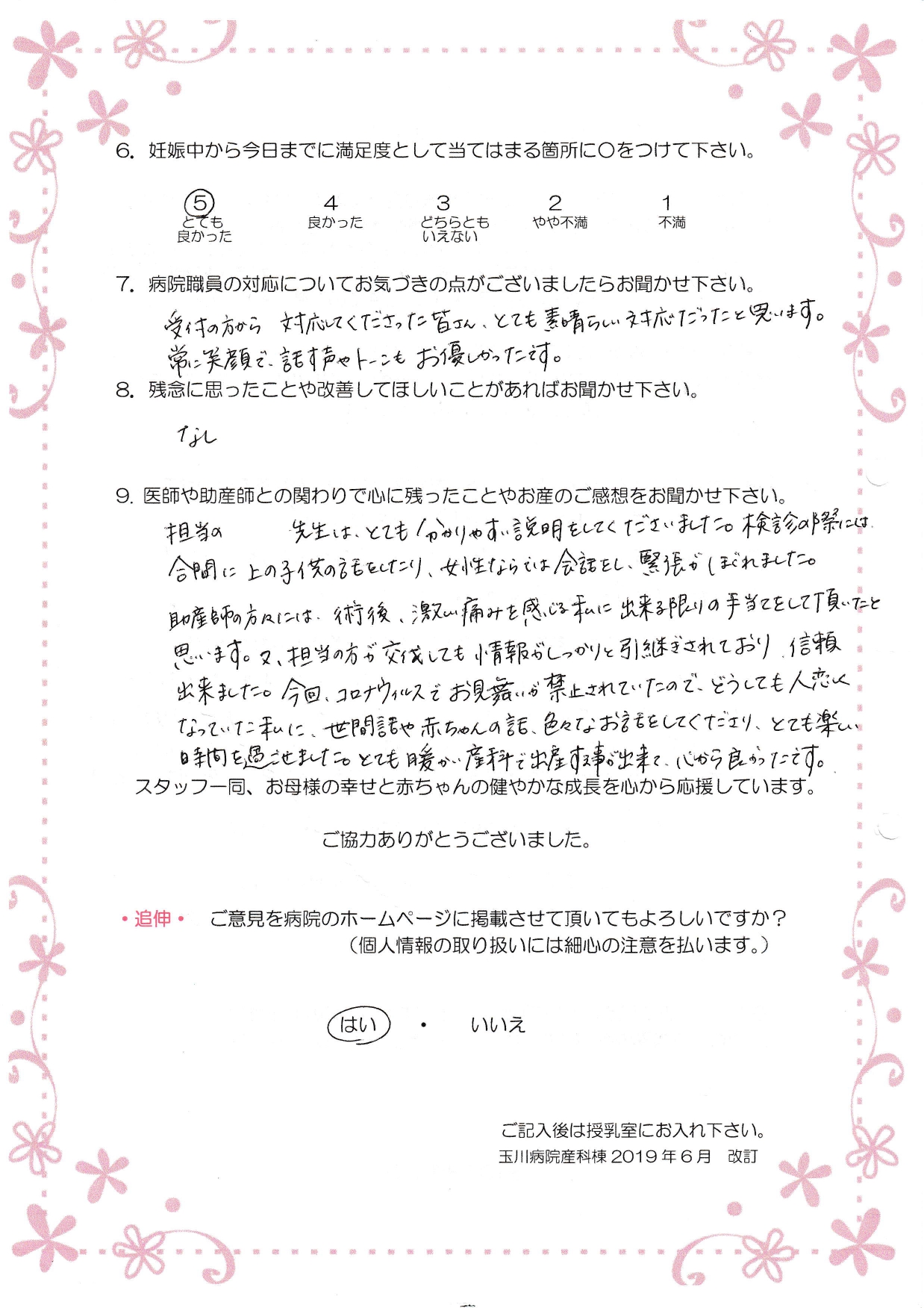 【9】担当の先生は、とても分かりやすい説明をしてくださいました。検診の際には、合間に上の子供の話をしたり、女性ならでは会話をし、緊張がほぐれました。助産師の方々には、術後、激しい痛みを感じる私に出来る限りの手当てをして頂いたと思います。又、担当の方が交代しても情報がしっかりと引継ぎされており、信頼出来ました。今回、コロナウイルスでお見舞いが禁止されていたので、どうしても人恋しくなっていた私に、世間話や赤ちゃんの話、色々なお話をしてくださり、とても楽しい時間を過ごせました。とても暖かい産科で出産する事が出来て、心から良かったです。