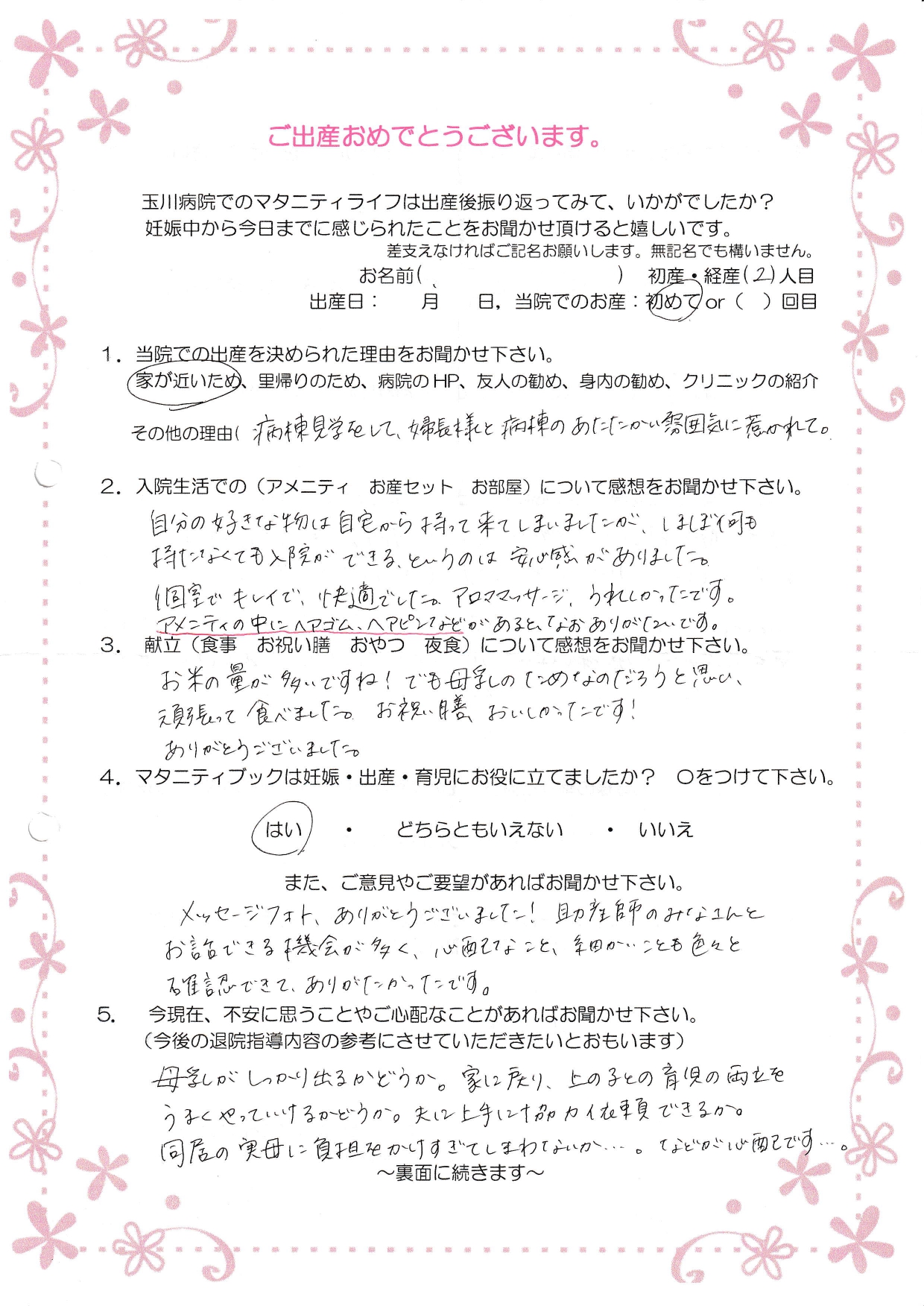 【2】自分の好きな物は自宅から持って来てしまいましたが、ほぼ何も持たなくても入院ができる、というのは安心感がありました。個室でキレイで、快適でした。アロママッサージ、うれしかったです。アメニティの中にヘアゴム、ヘアピンなどがあると、なおありがたいです。