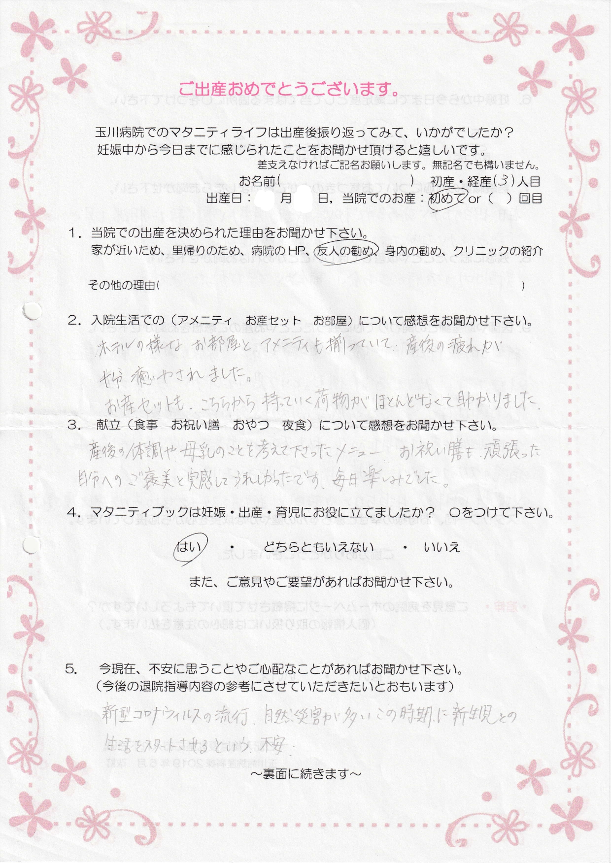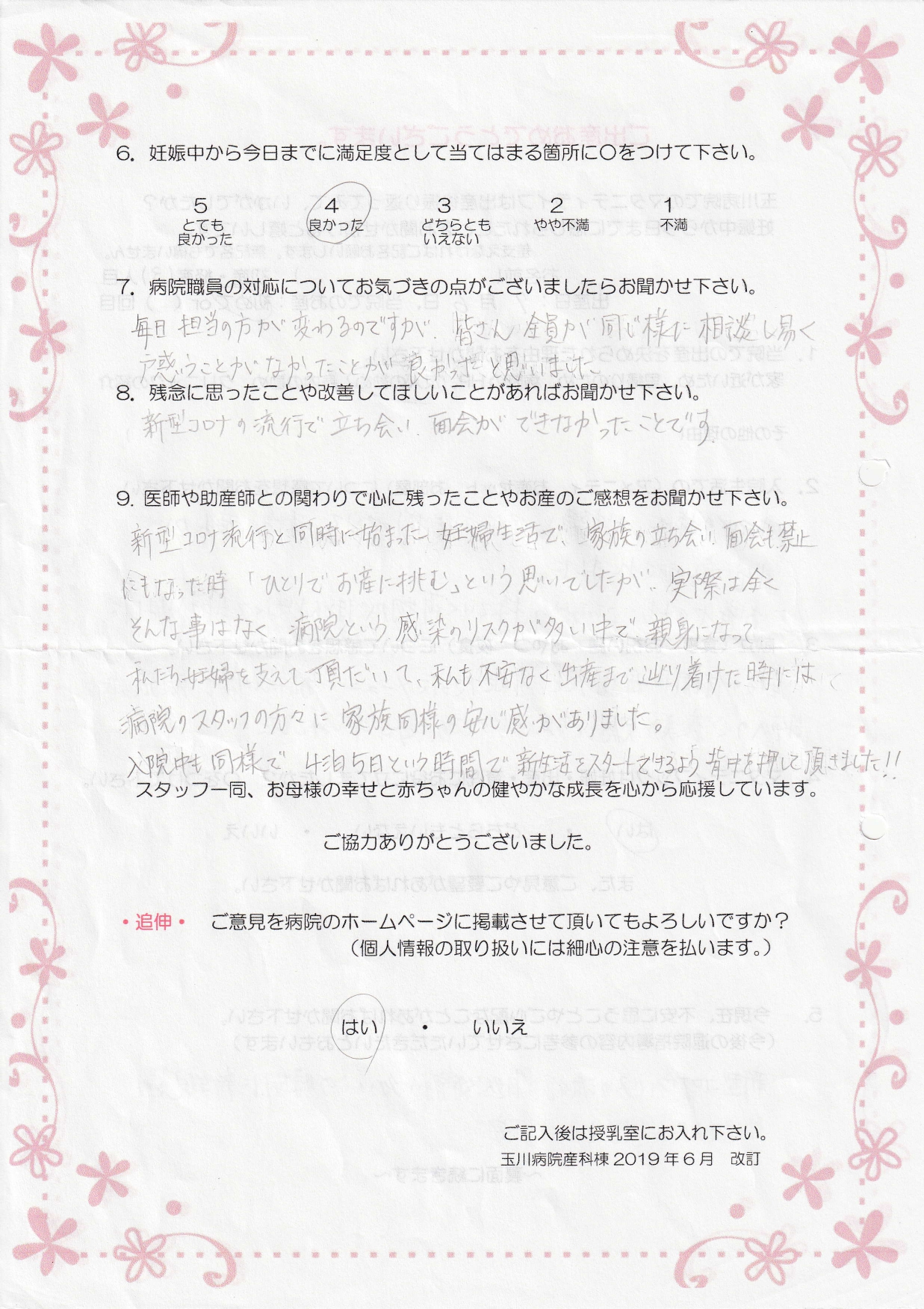 【9】新型コロナ流行と同時に始まった妊婦生活で、家族の立ち会い、面会も禁止にもなった時、「ひとりでお産に挑む」という思いでしたが、実際は全くそんな事はなく、病院という感染リスクが多い中で親身になって私たち妊婦を支えて頂だいて、私も不安なく出産まで辿り着けた時には、病院のスタッフの方々に家族同様の安心感がありました。入院中も同様で、4泊5日という時間で新生活をスタートできるよう背中を押して頂きました‼