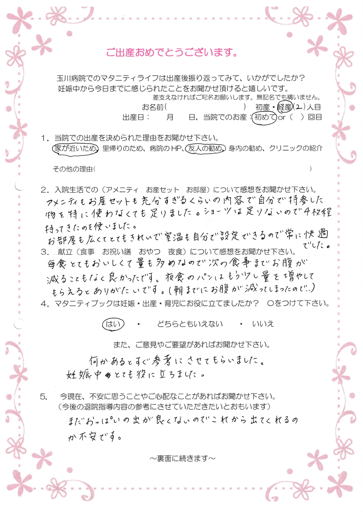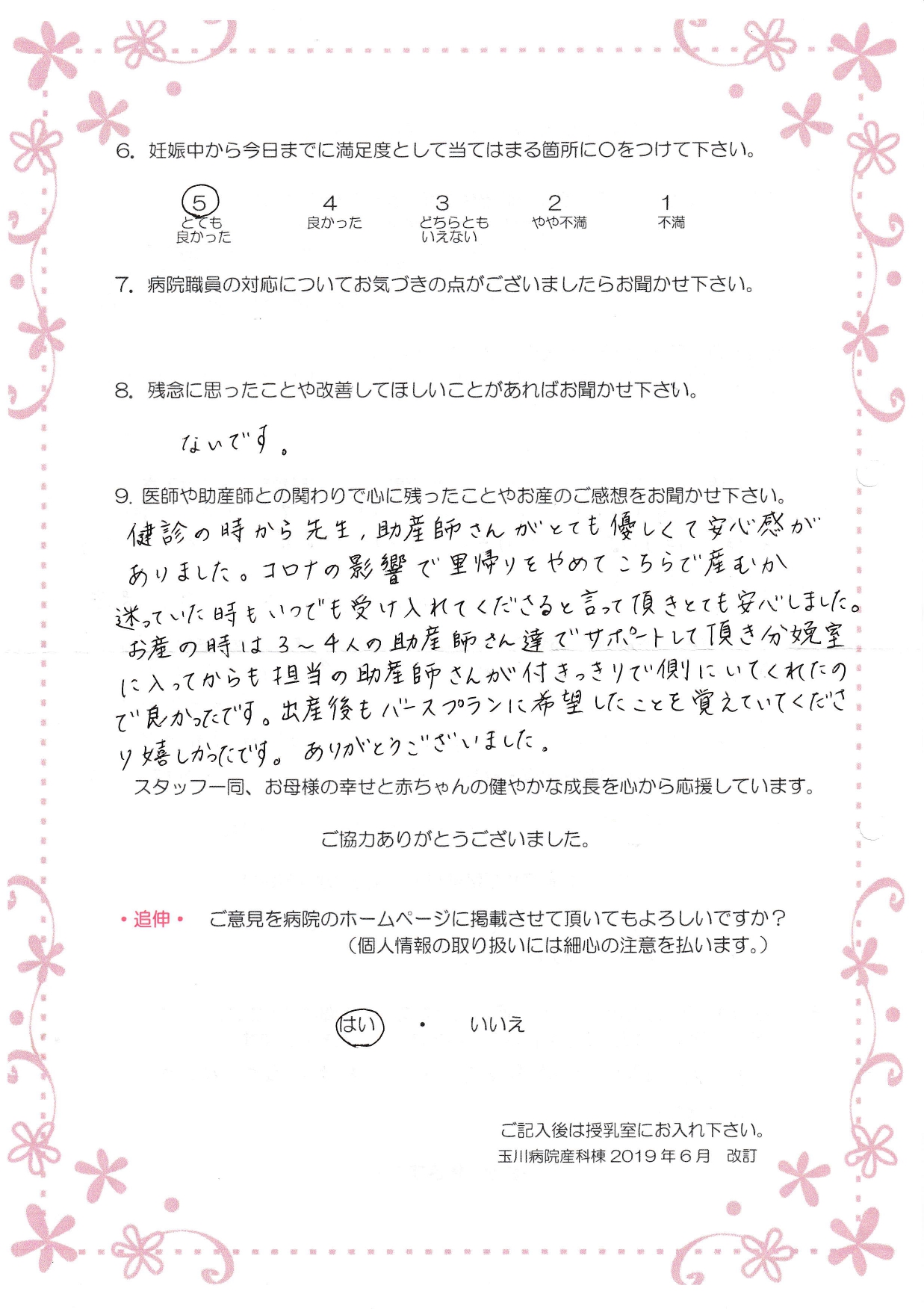 【9】健診の時から先生、助産師さんがとても優しくて安心感がありました。コロナの影響で里帰りをやめてこちらで産むか迷っていた時もいつでも受け入れてくださると言って頂きとても安心しました。お産の時は3~4人の助産師さん達でサポートして頂き分娩室に入ってからも担当の助産師さんが付きっきりで側にいてくれたので良かったです。出産後もバースプランに希望したことを覚えていてくださり嬉しかったです。ありがとうございました。