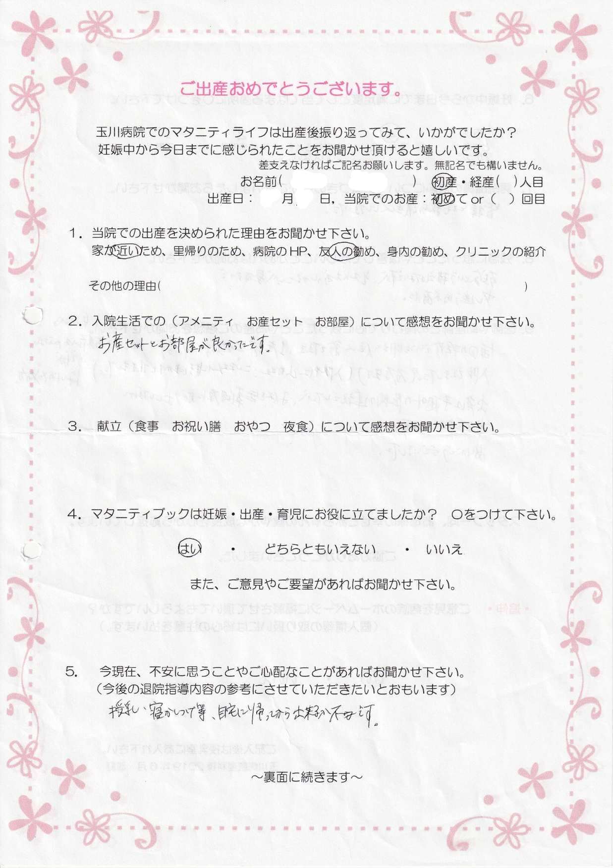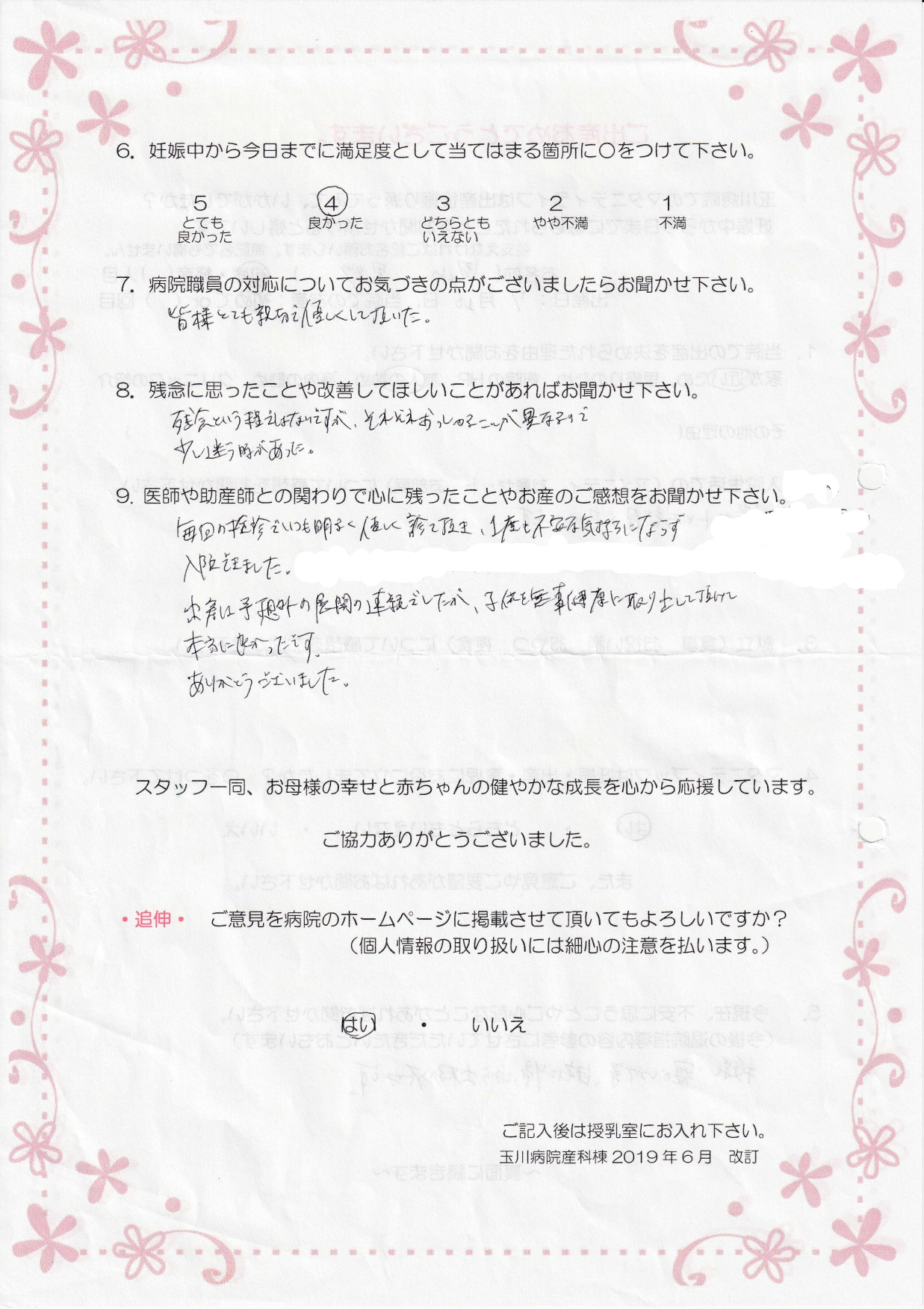 【9】毎回の検診でいつも明るく優しく診て頂き、1度も不安な気持ちにならず入院できました。出産は予想外の展開の連続でしたが、子供を無事健康に取り出して頂けて本当に良かったです。ありがとうございました。
