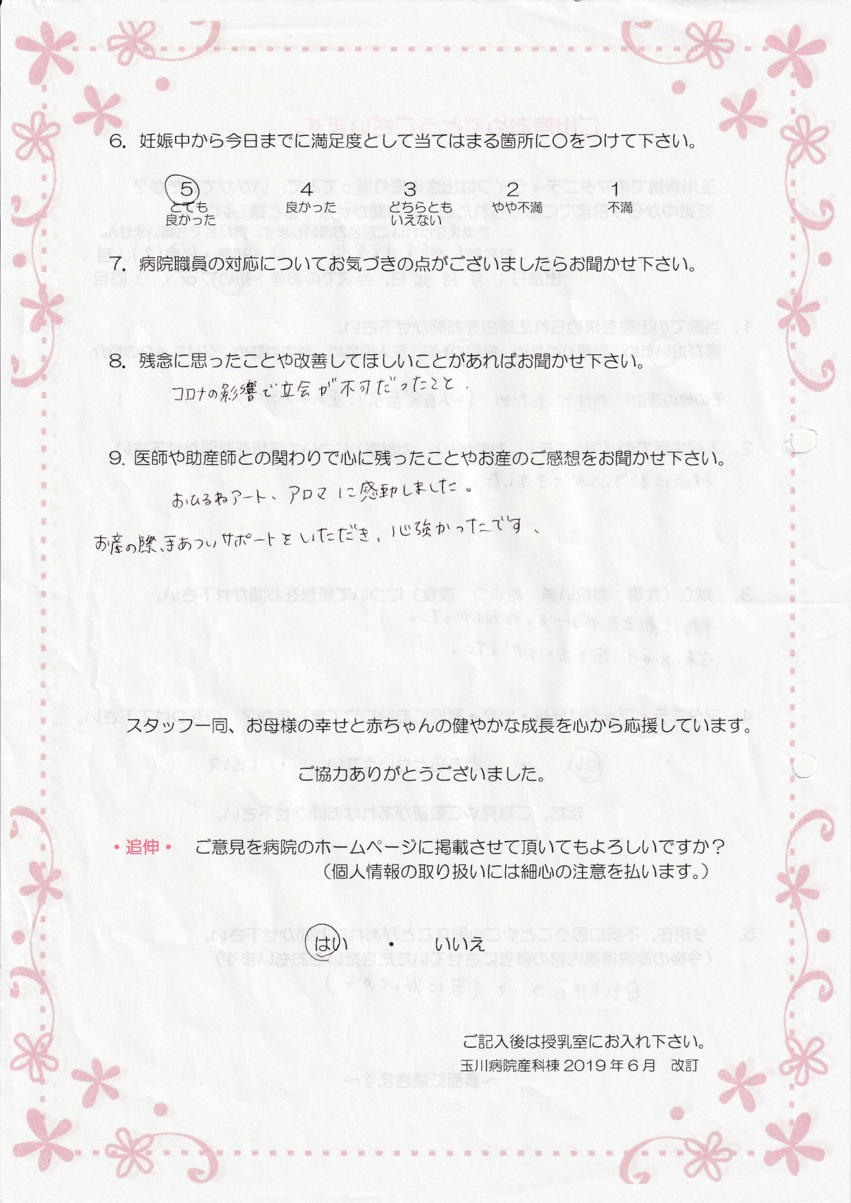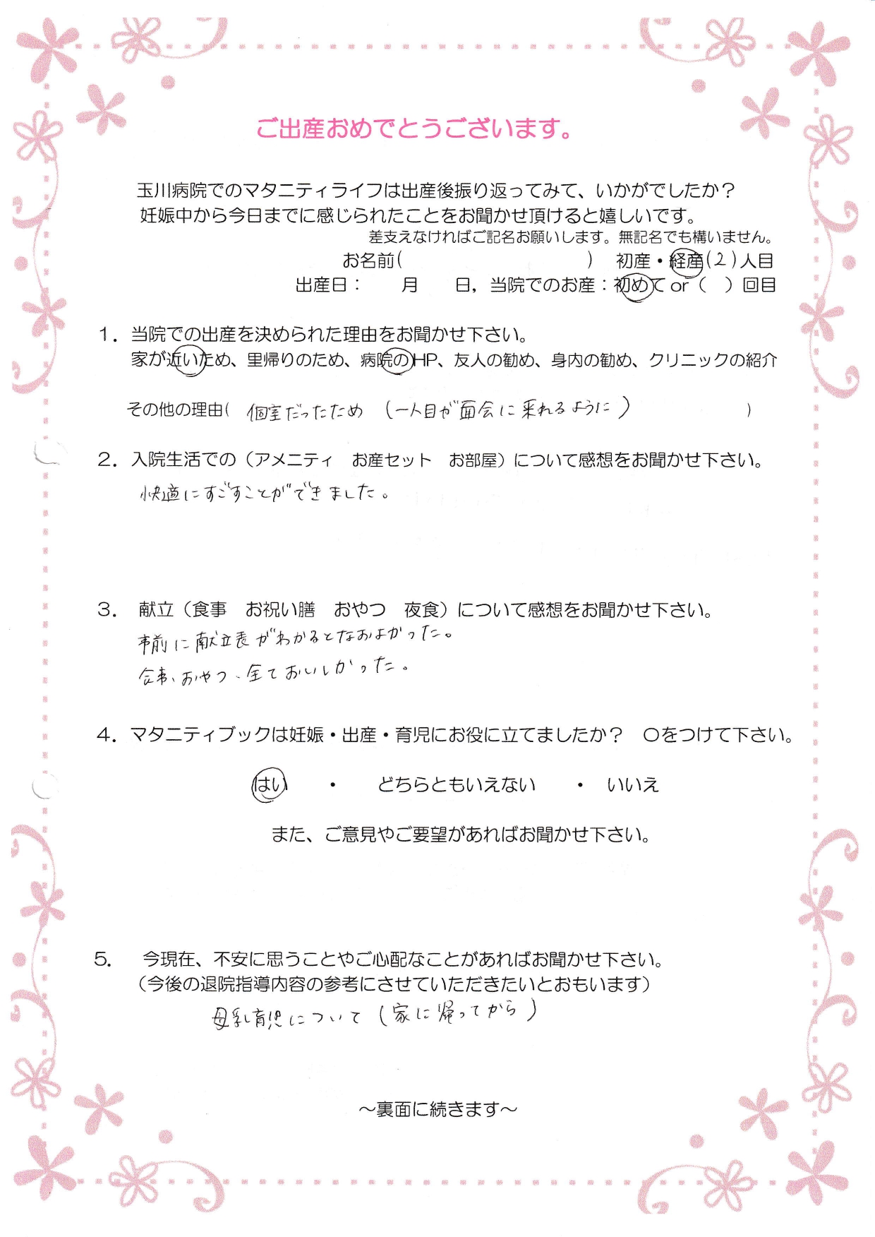 先輩ママさん 64 2020.10.8 【1】家が近いため、病院のHP、個室だったため(一人目が面会に来れるように) 【2】快適にすごすことができました。 【3】事前に献立表がわかるとなおよかった。食事、おやつ、全ておいしかった。 【4】はい 【5】母乳育児について(家に帰ってから) 【6】5 とても良かった 【7】無回答 【8】コロナの影響で立会が不可だったこと 【9】おひるねアート、アロマに感動しました。お産の際、手あついサポートをいただき、心強かったです。 先輩ママさん 63前の記事 先輩ママさん 65次の記事