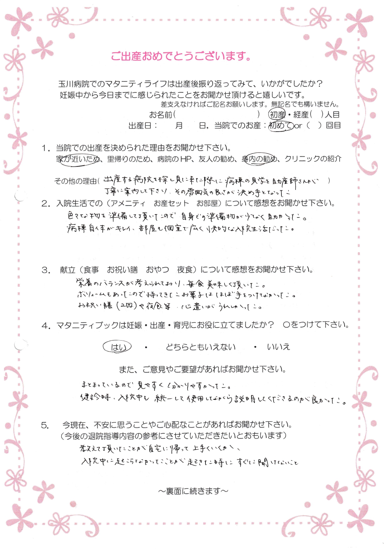 【4】はい まとまっているので見やすく分かりやすかった。健診時、入院中も統一して使用しながら説明してくださるのが良かった。