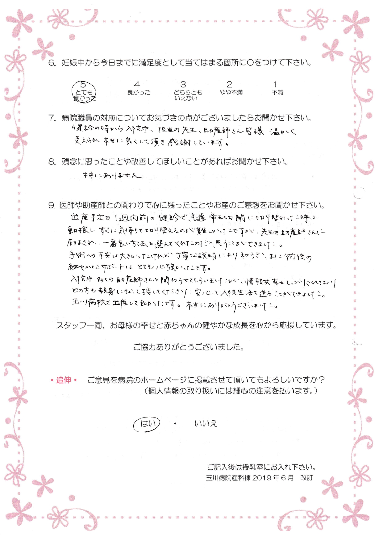 【9】出産予定日1週間前の健診で、急遽帝王切開に切り替わったときは動揺しすぐに気持ちを切り替えるのが難しかったですが、先生や助産師さんに励まされ、一番良い方法を選んでくれたのだと思うことができました。手術への不安は大きかったけれど丁寧な説明により和らぎ、また術後の細やかなサポートはとても心強かったです。入院中多くの助産師さんと関わらせてもらいましたが、情報共有もしっかりされておりどの方も親身になって接してくださり、安心して入院生活を送ることができました。玉川病院で出産して良かったです。本当にありがとうございました。
