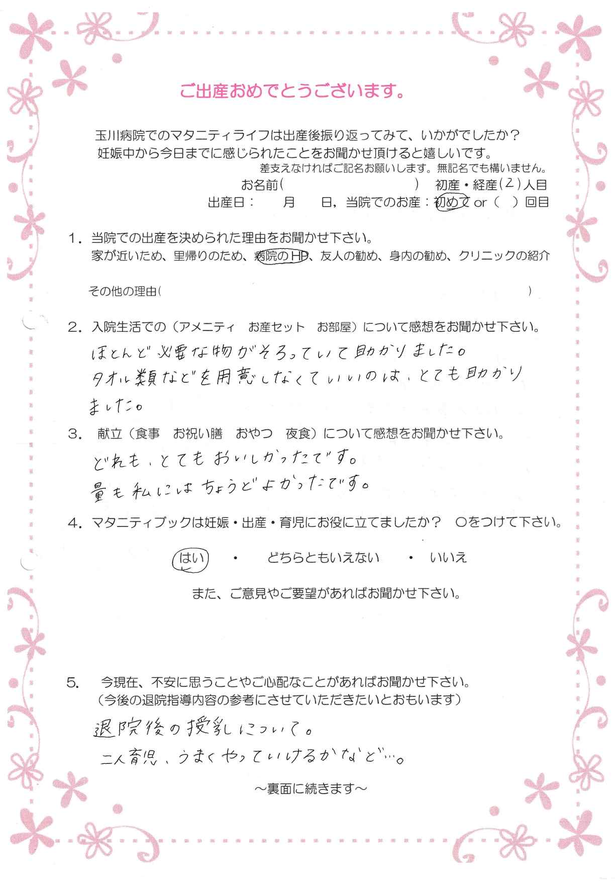 【9】先生も助産師さんもとてもしんせつであたたかい方々ばかりでした。帝王切開、前日のアロマケアでとてもリラックスができ、夜、ねむる事ができました。当日も、常に笑顔で接して下さり、手術中も一番不安な時に手をにぎって、笑いかけて下さりとても、安心できました。うまれたての赤ちゃんを見せてくれたり、ふれさせて頂けて本当にいい思い出です。笑顔がステキな先生や、助産師さんにかこまれて、よい出産ができました。ありがとうございました。