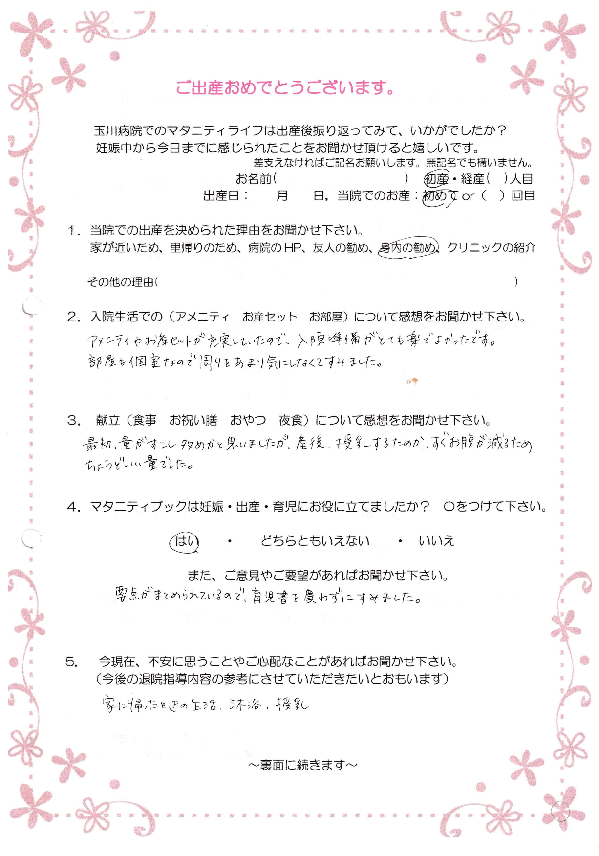 【2】アメニティやお産セットが充実していたので、入院準備がとても楽でよかったです。部屋も個室なので周りをあまり気にしなくてすみました。
