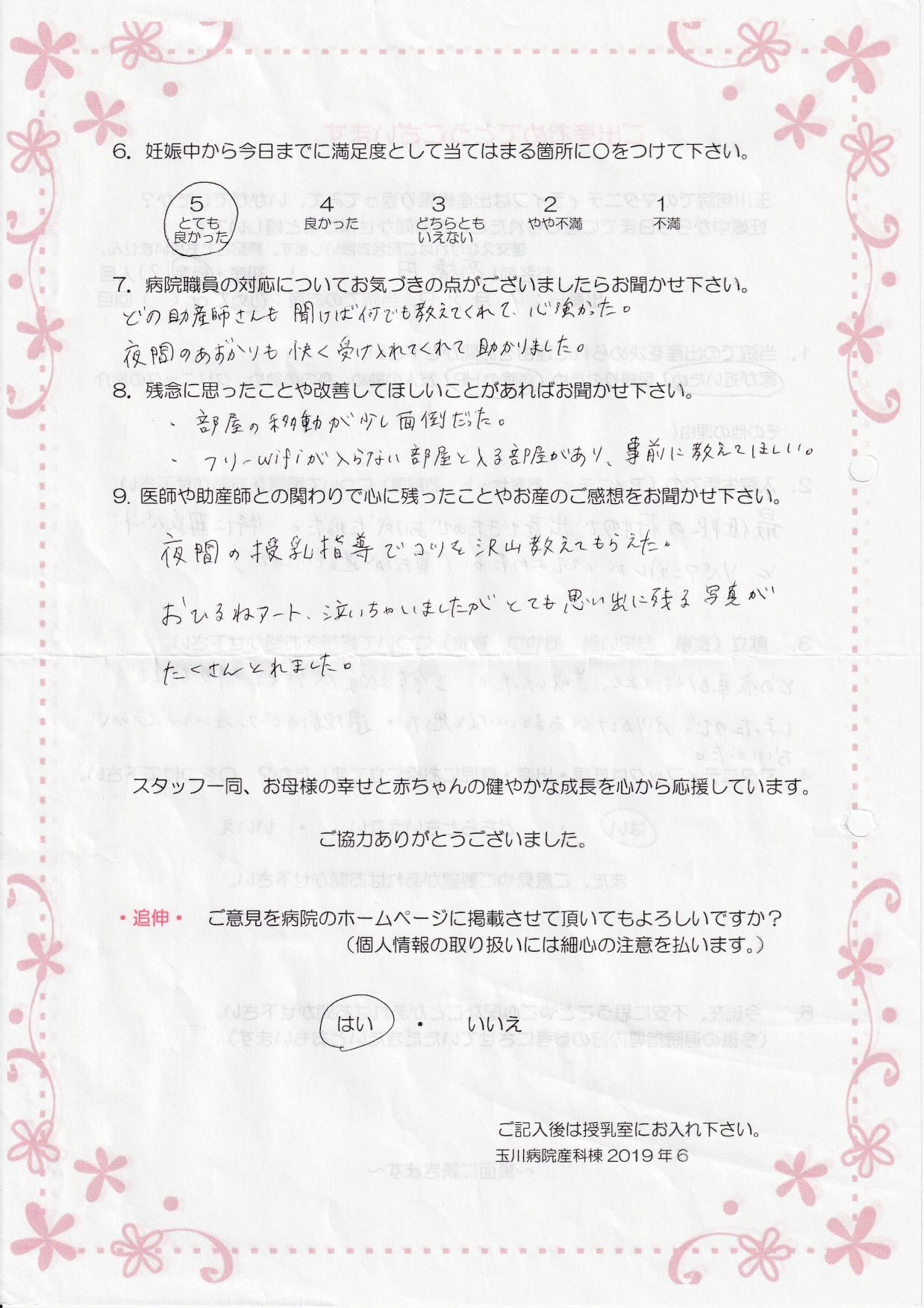 【7】どの助産師さんも聞けば何でも教えてくれて、心強かった。夜間のあずかりも快く受け入れてくれて助かりました。