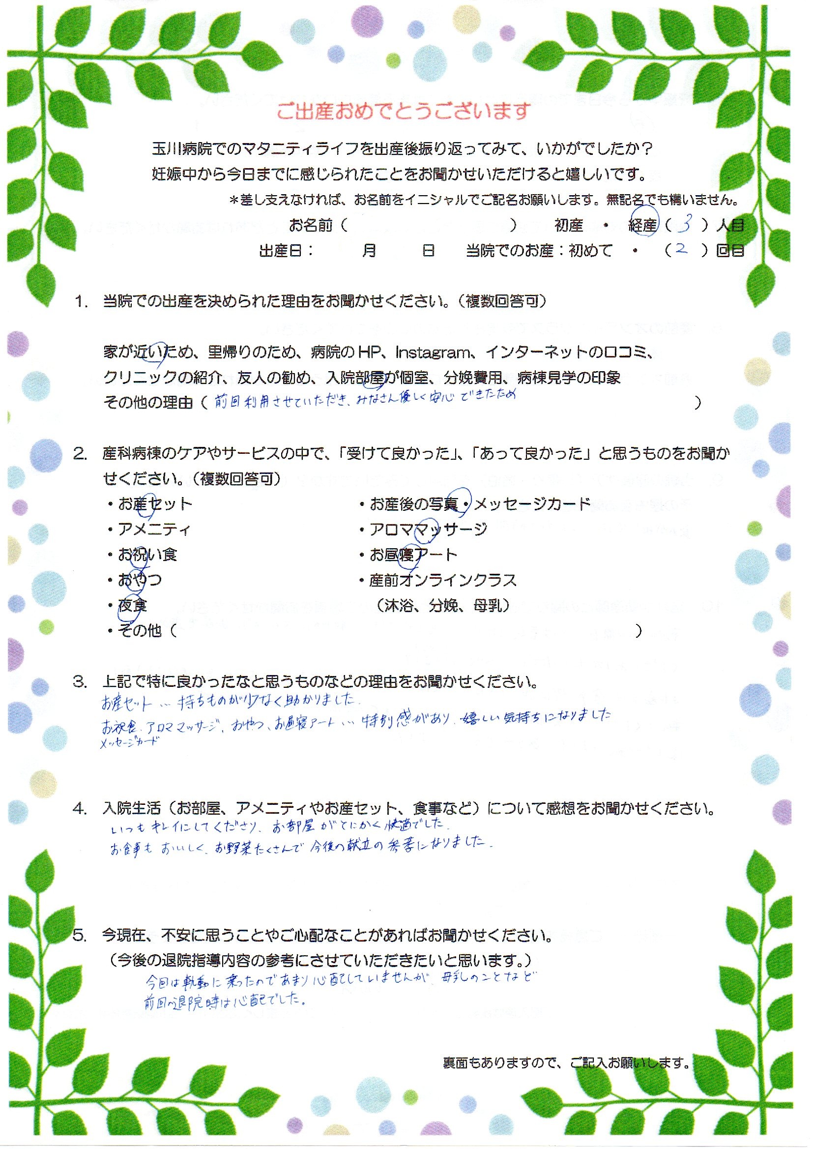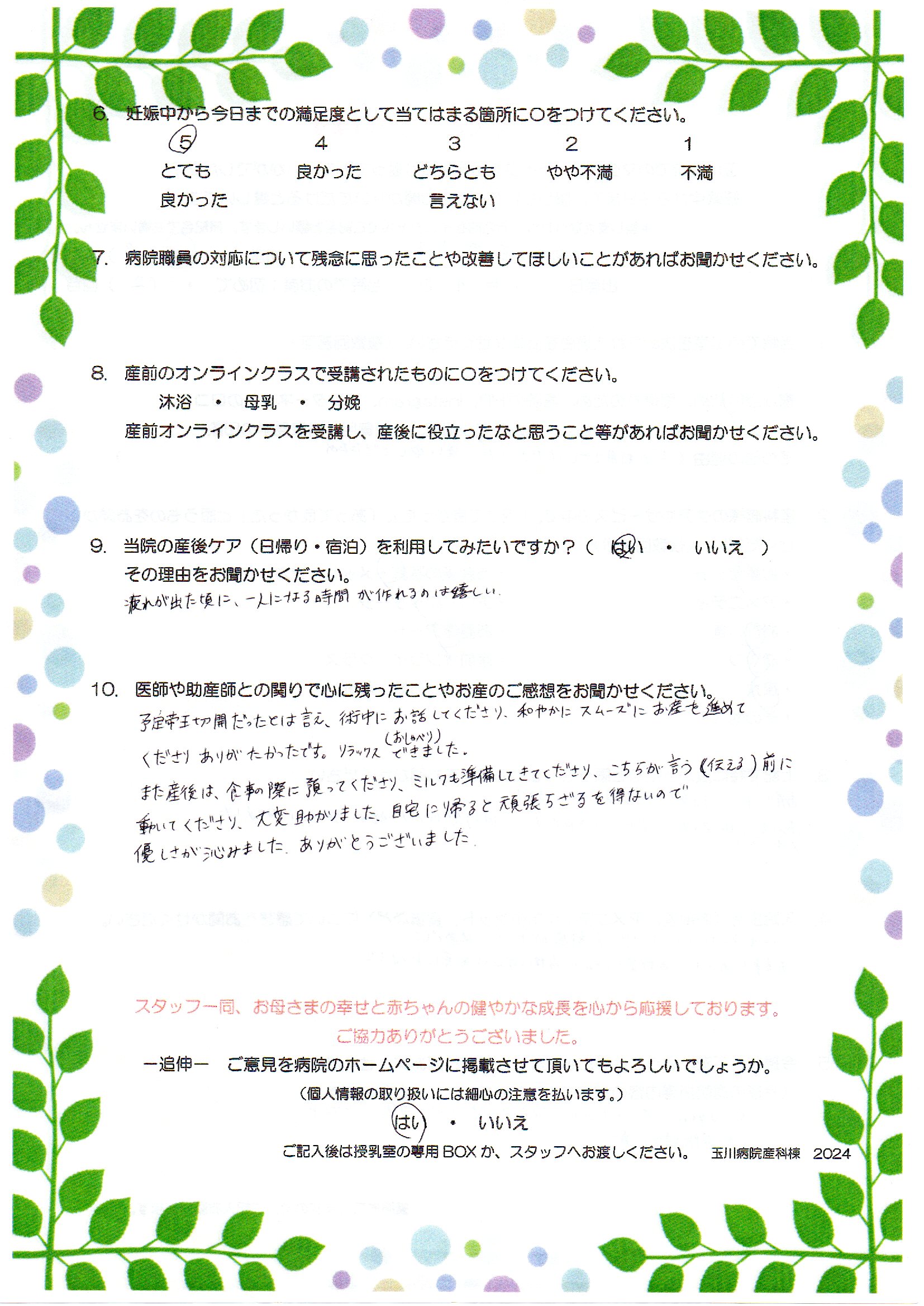 予定帝王切開だったとは言え、術中にお話してくださり、和やかにスムーズにお産を進めてくださりありがたかったです。リラックス(おしゃべり)できました。また産後は、食事の際に預かってくださり、ミルクも準備してく来て下さり、こちらが言う(伝える)前に動いて下さり大変助かりました。自宅に帰ると頑張らざるを得ないので優しさが沁みました。ありがとうございました。