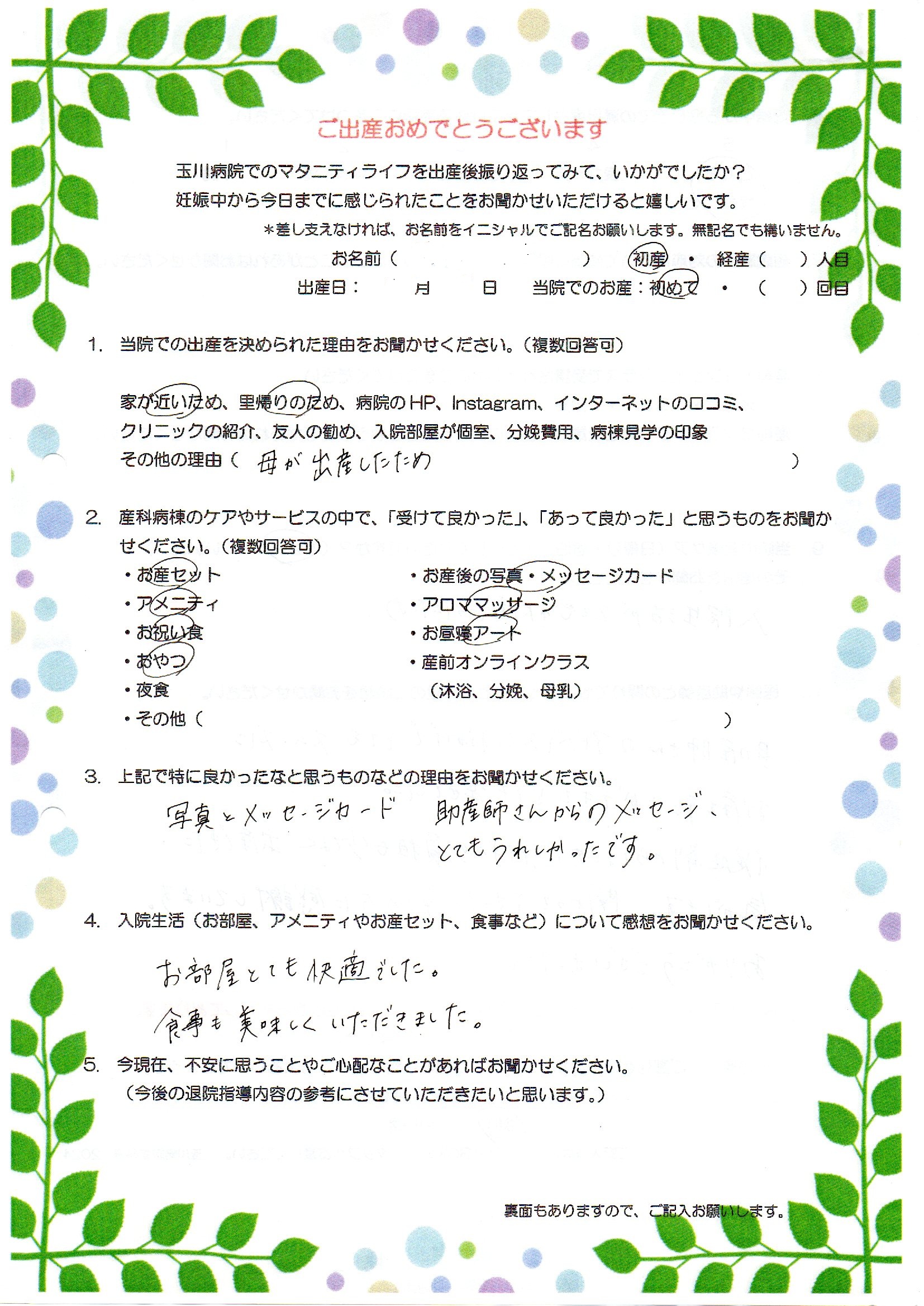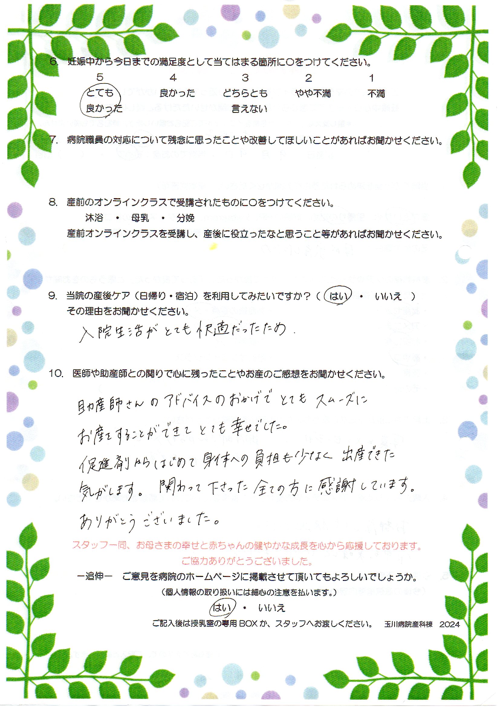 助産師さんのアドバイスのおかげでとてもスムーズにお産をすることができてとても幸せでした。促進剤からはじめて身体への負担も少なく出産できた気がします。関わって下さった全ての方に感謝しています。ありがとうございました。