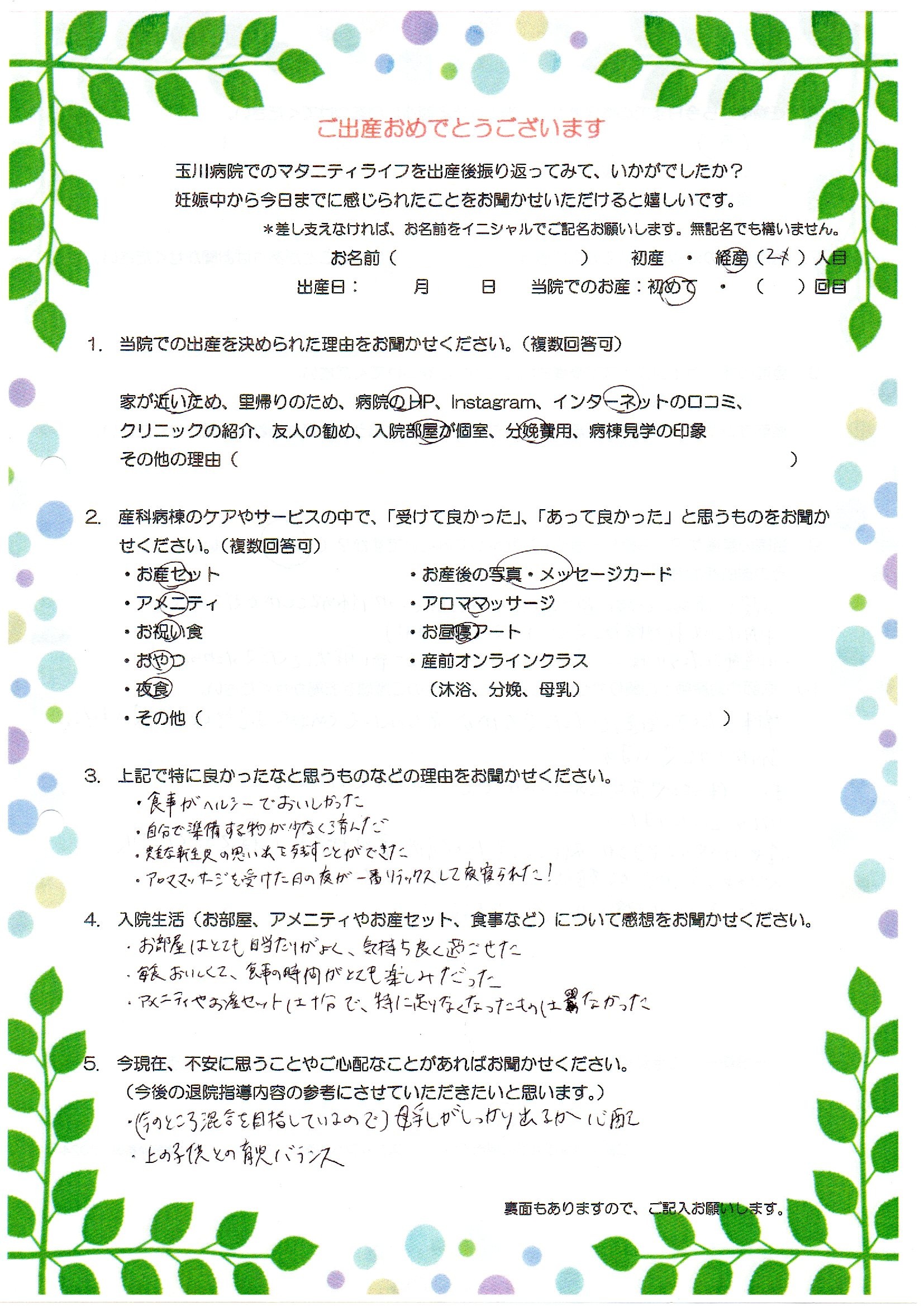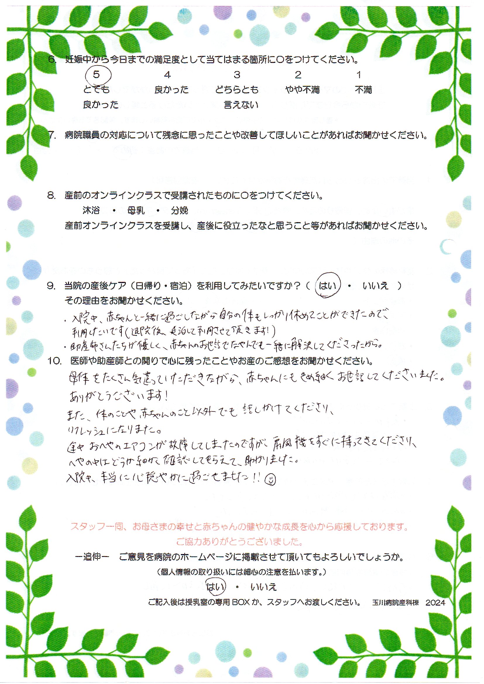 母体をたくさん気遣っていただきながら、赤ちゃんにもきめ細くお世話してくださいました。ありがとうございます!また、体のことや赤ちゃんのこと以外でも話しかけてくださり、リフレッシュになりました。途中おへやのエアコンが故障してしまったのですが、扇風機をすぐに持ってきてくださり、へやの中はどうか細かく確認してもらえて、助かりました。入院中、本当に心穏やかに過ごせました!!☺