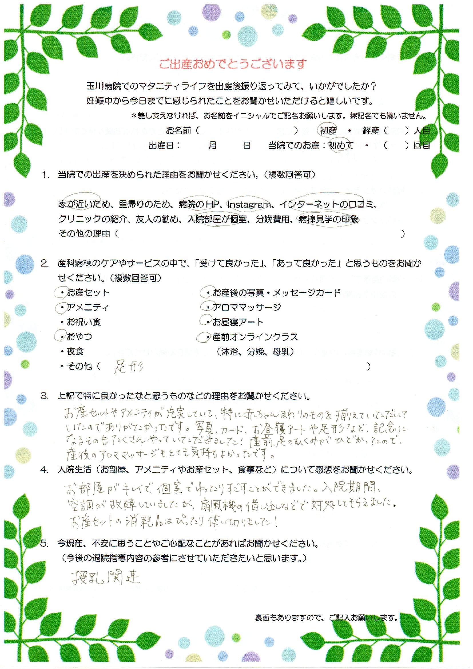 お部屋がキレイで、個室でゆったりすごすことができました。入院期間、空調が故障していましたが、扇風機の貸し出しなどで対処してもらえました。お産セットの消耗品はぴったり使い切りました!