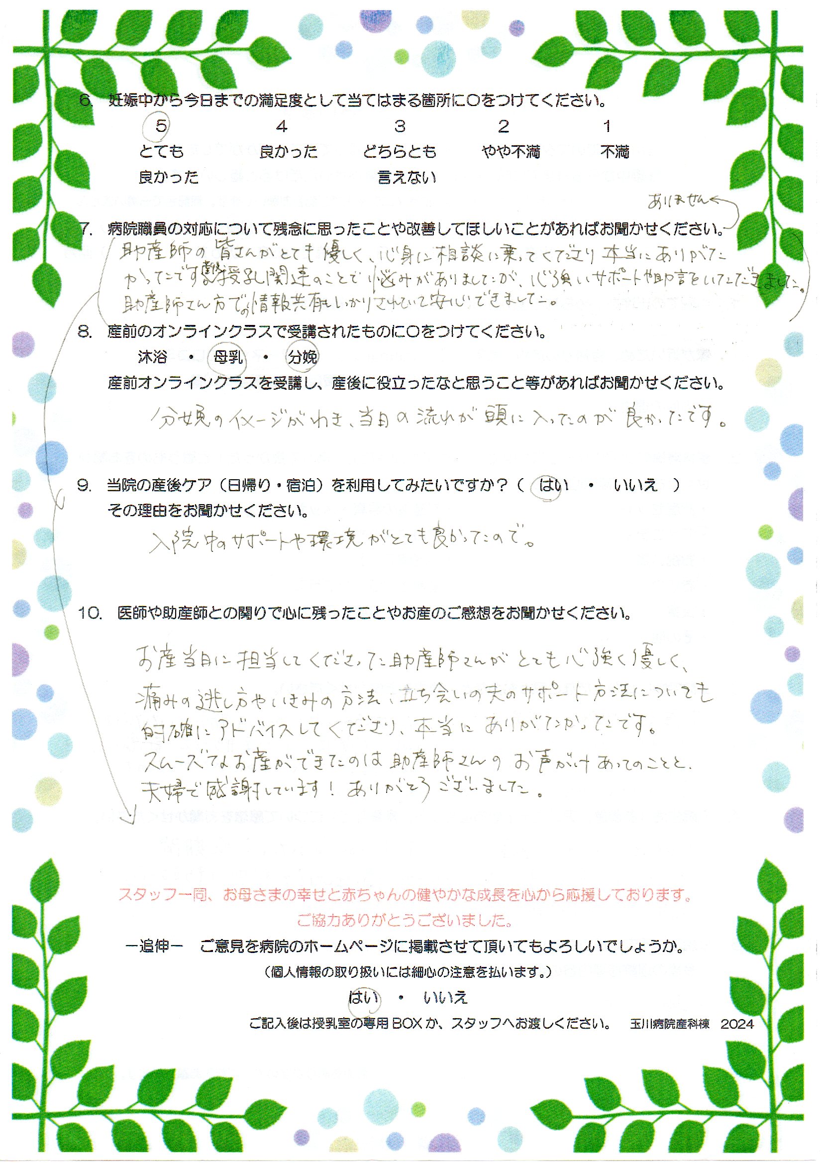 お産当日に担当してくださった助産師さんがとても心強く優しく、痛みの逃し方やいきみの方法、立ち会いの夫のサポート方法についても的確にアドバイスしてくださり、本当にありがたかったです。スムーズなお産ができたのは助産師さんのお声がけあってのことと、夫婦で感謝しています!ありがとうございました。
