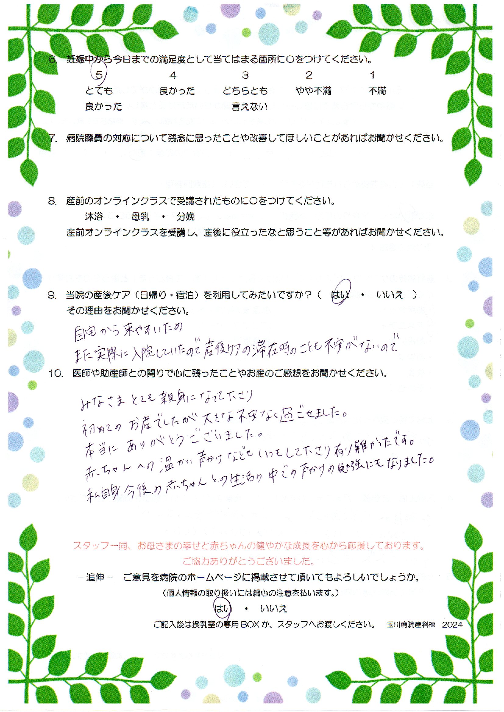 みなさまとても親身になって下さり初めてのお産でしたが大きな不安なく過ごせました。本当にありがとうございました。赤ちゃんへの温かい声かけなどもいつもして下さり有り難かったです。私自身今後の赤ちゃんとの生活の中での声かけの勉強にもなりました。