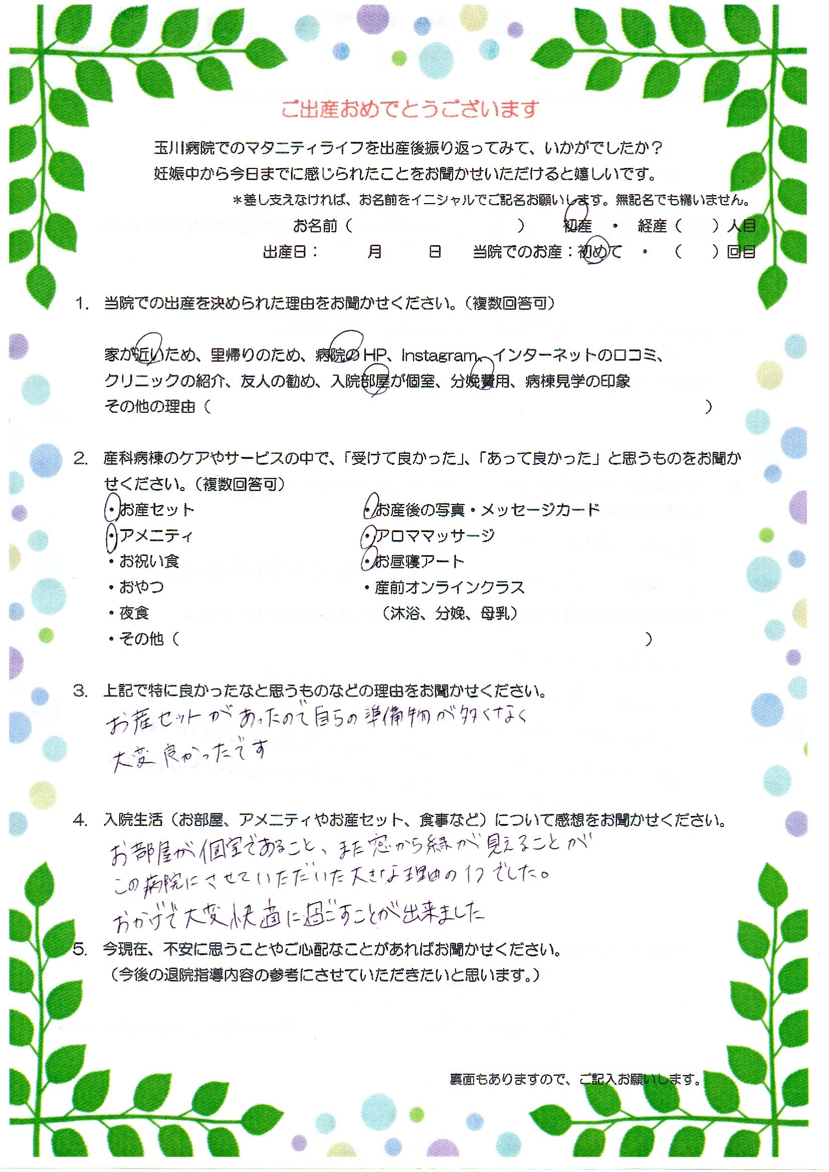 みなさまとても親身になって下さり初めてのお産でしたが大きな不安なく過ごせました。本当にありがとうございました。赤ちゃんへの温かい声かけなどもいつもして下さり有り難かったです。私自身今後の赤ちゃんとの生活の中での声かけの勉強にもなりました。