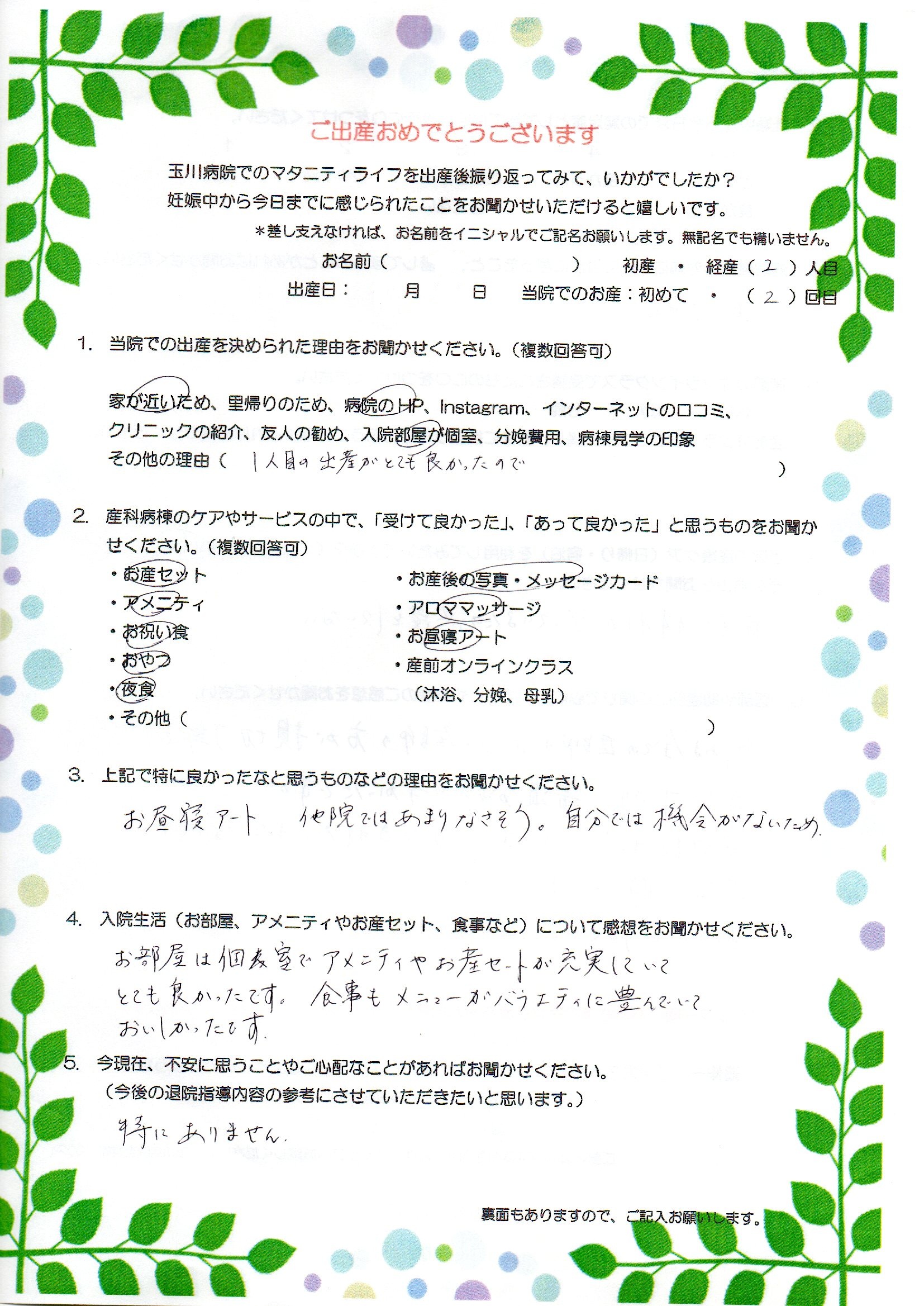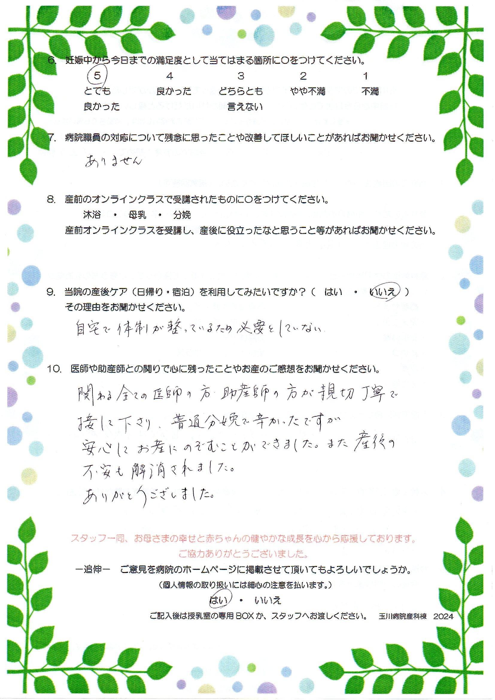 関わる全ての医師の方・助産師の方が親切丁寧で接して下さり、普通分娩で辛かったですが安心してお産にのぞむことができました。また産後の不安も解消されました。ありがとうございました。
