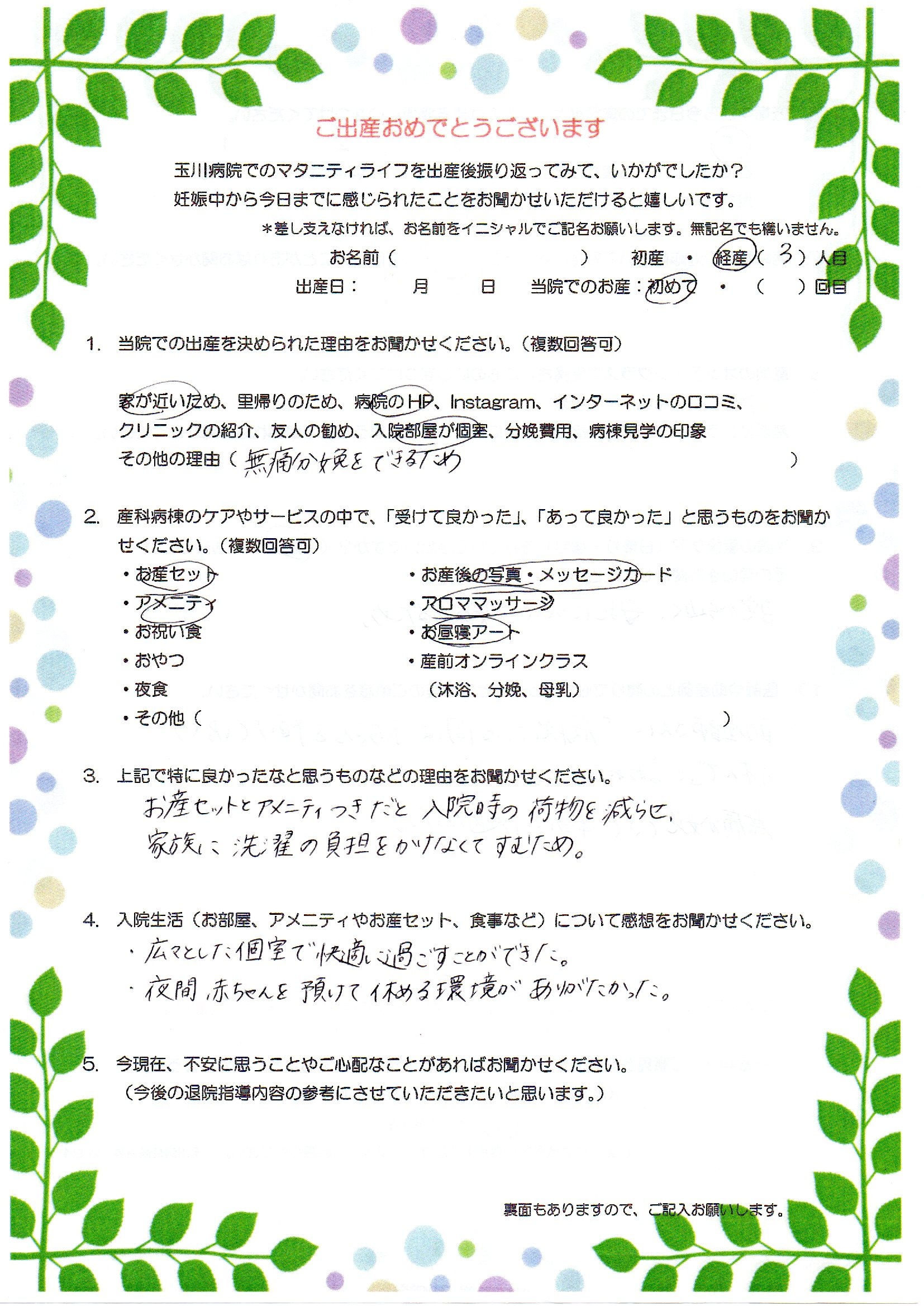助産師さんに「病院にいる間は赤ちゃんを預けてゆっくり休んで」と言われたこと。無痛分娩できて本当に快適だった。
