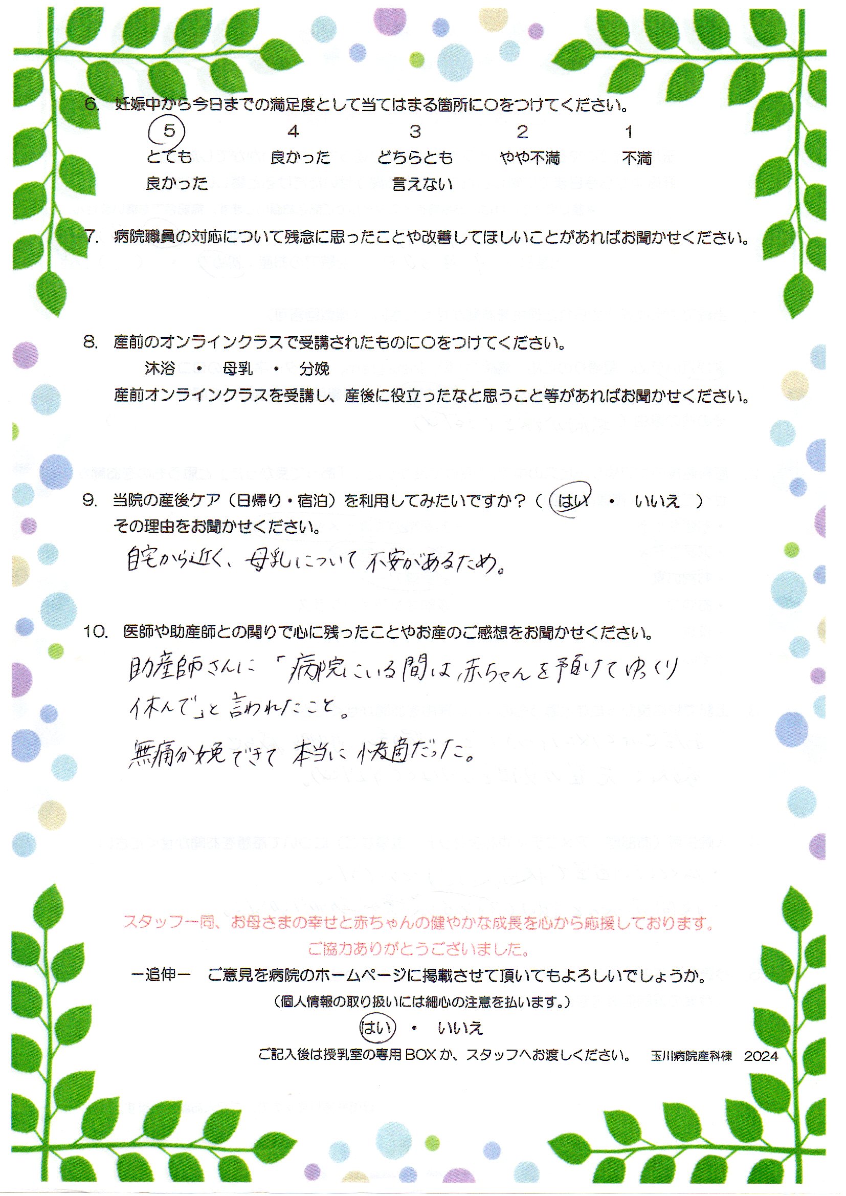 自宅から近く、母乳について不安があるため。