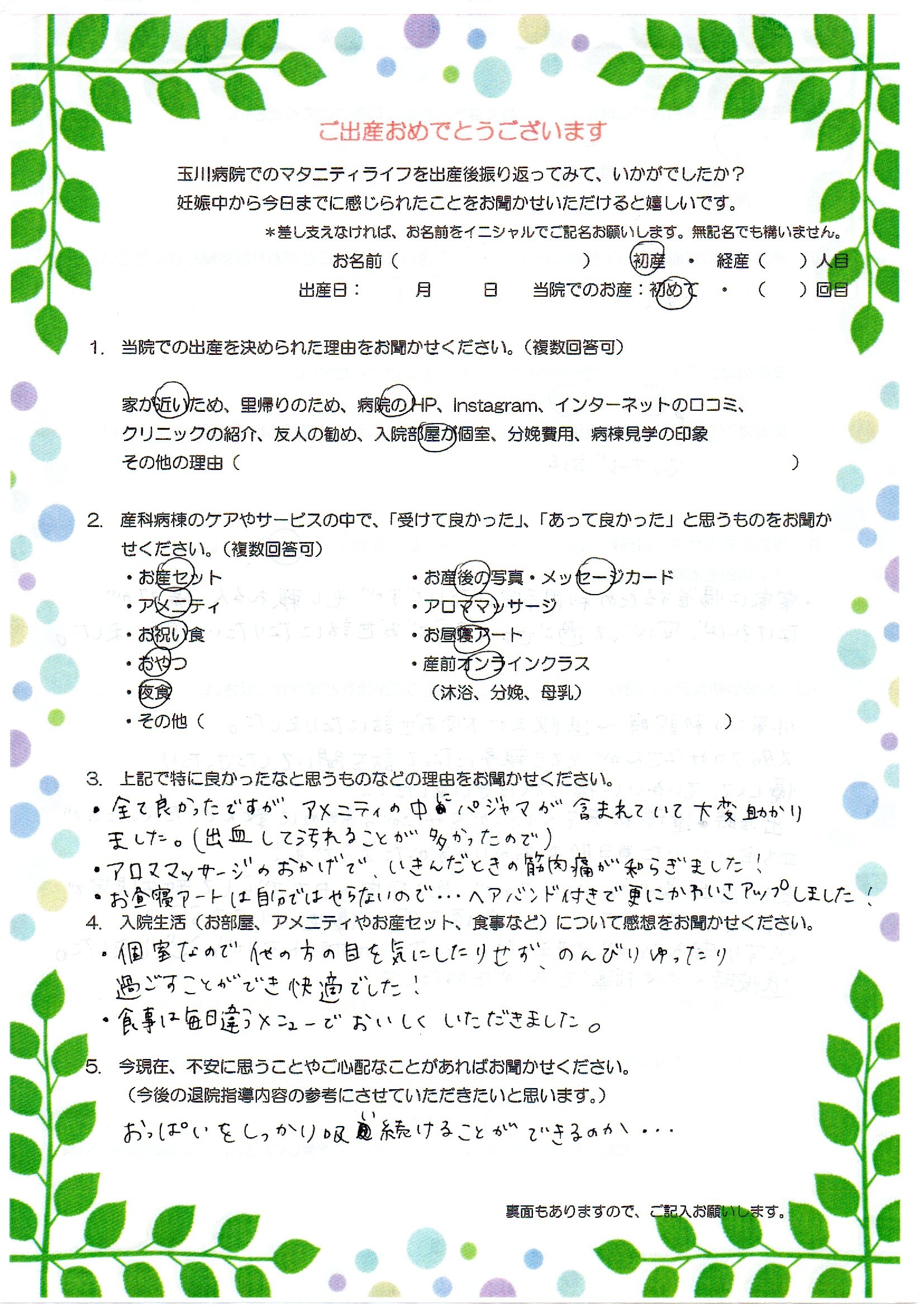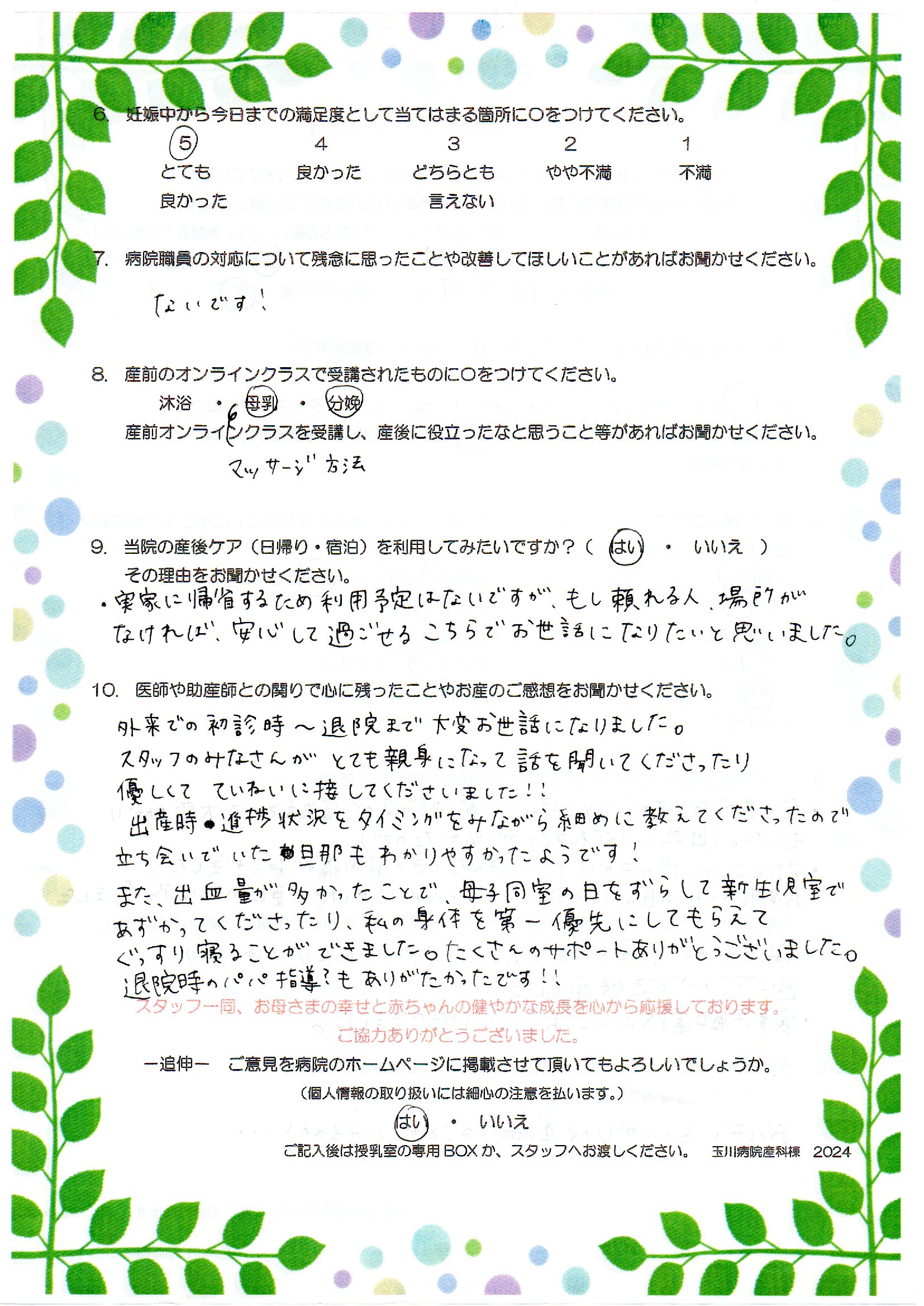 外来での初診時~退院まで大変お世話になりました。スタッフのみなさんがとても親身になって話を聞いてくださったり優しくてていねいに接してくださいました!!出産時、進捗状況をタイミングをみながら細めに教えてくださったので立ち会いでいた旦那もわかりやすかったようです!また、出血量が多かったことで、母子同室の日をずらして新生児室であずかってくださったり、私の身体を第一優先にしてもらえてぐっすり寝ることができました。たくさんのサポートありがとうございました。退院時のパパ指導?もありがたかったです!!