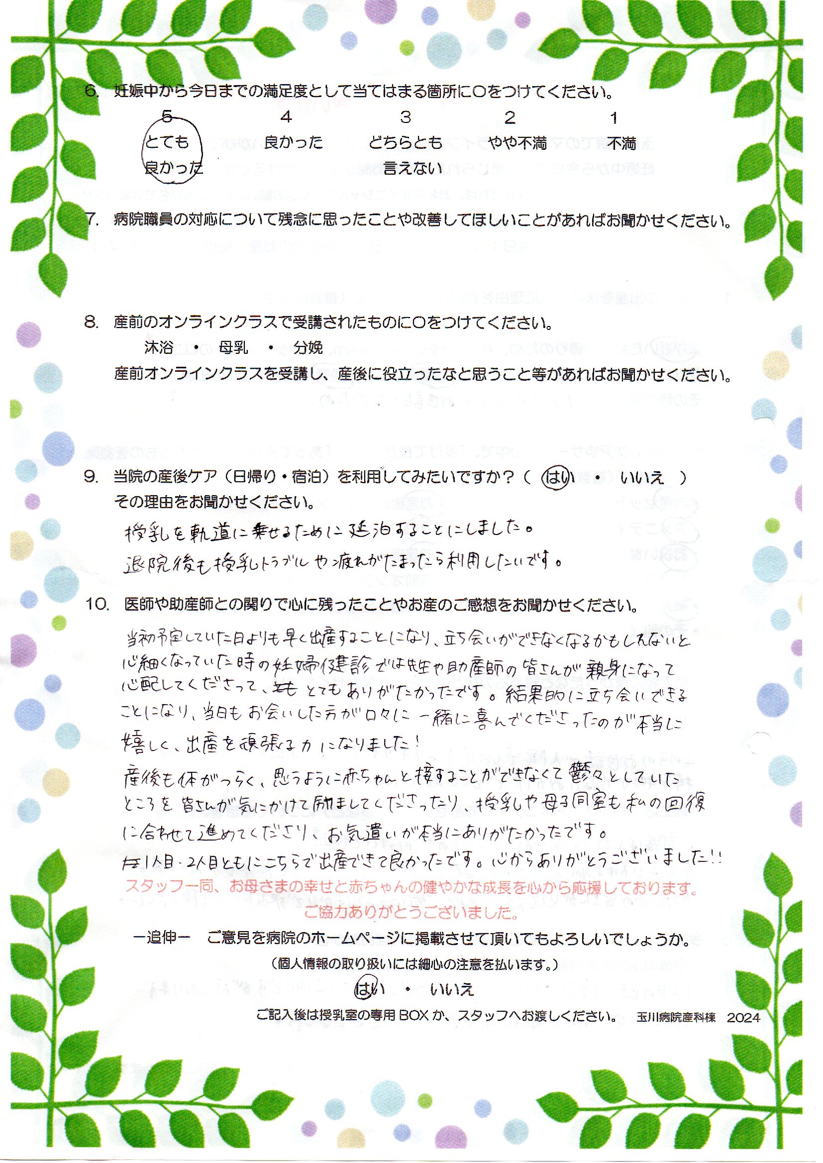 当初予定していた日よりも早く出産することになり、立ち会いができなくなるかもしれないと心細くなっていた時の妊婦健診では先生や助産師の皆さんが親身になって心配してくださって、とてもありがたかったです。結果的に立ち会いできることになり、当日もお会いした方が口々に一緒に喜んでくださったのが本当に嬉しく、出産を頑張る力になりました!産後も体がつらく、思うように赤ちゃんと接することができなくて鬱々としていたところを皆さんが気にかけて励ましてくださったり、授乳や母子同室も私の回復に合わせて進めてくださり、お気遣いが本当にありがたかったです。1人目・2人目ともにこちらで出産できて良かったです。心からありがとうございました!!