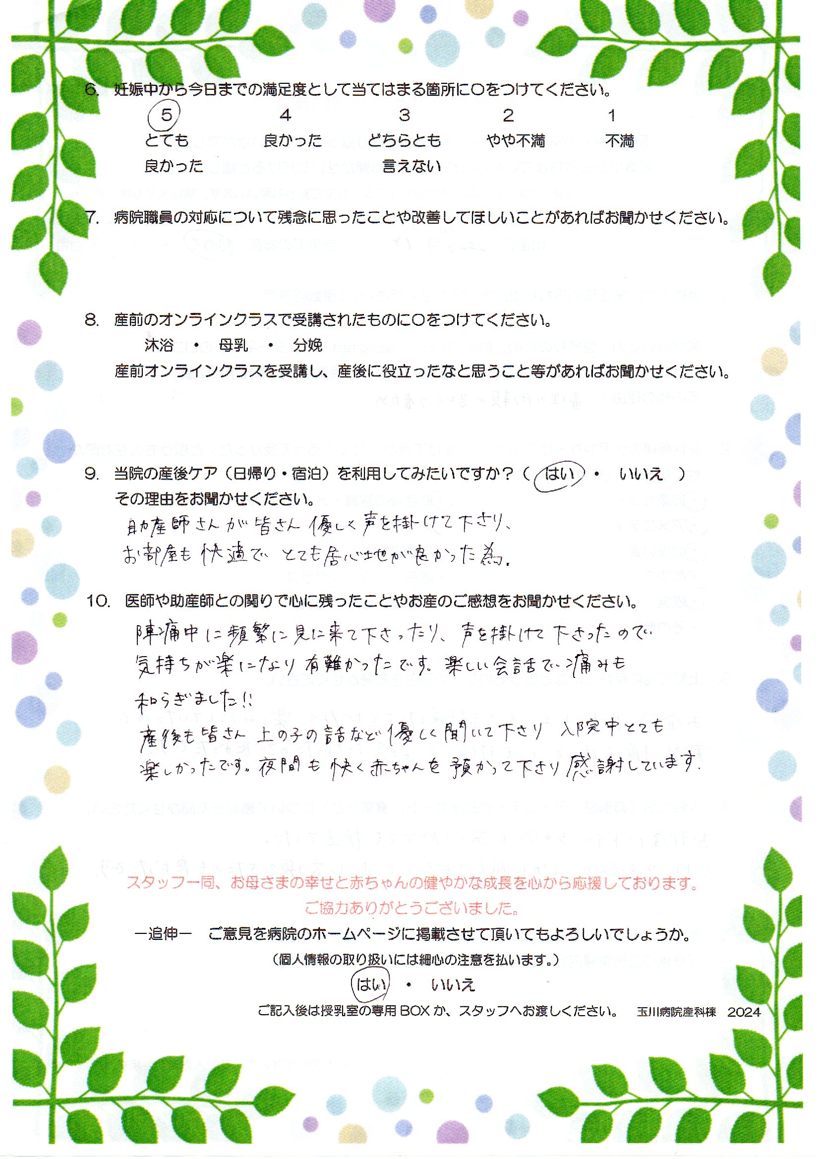 陣痛中に頻繁に見に来て下さったり、声を掛けて下さったので気持ちが楽になり有難かったです。楽しい会話で痛みも和らぎました!!産後も皆さん上の子の話など優しく聞いて下さり入院中とても楽しかったです。夜間も快く赤ちゃんを預かって下さり感謝しています。