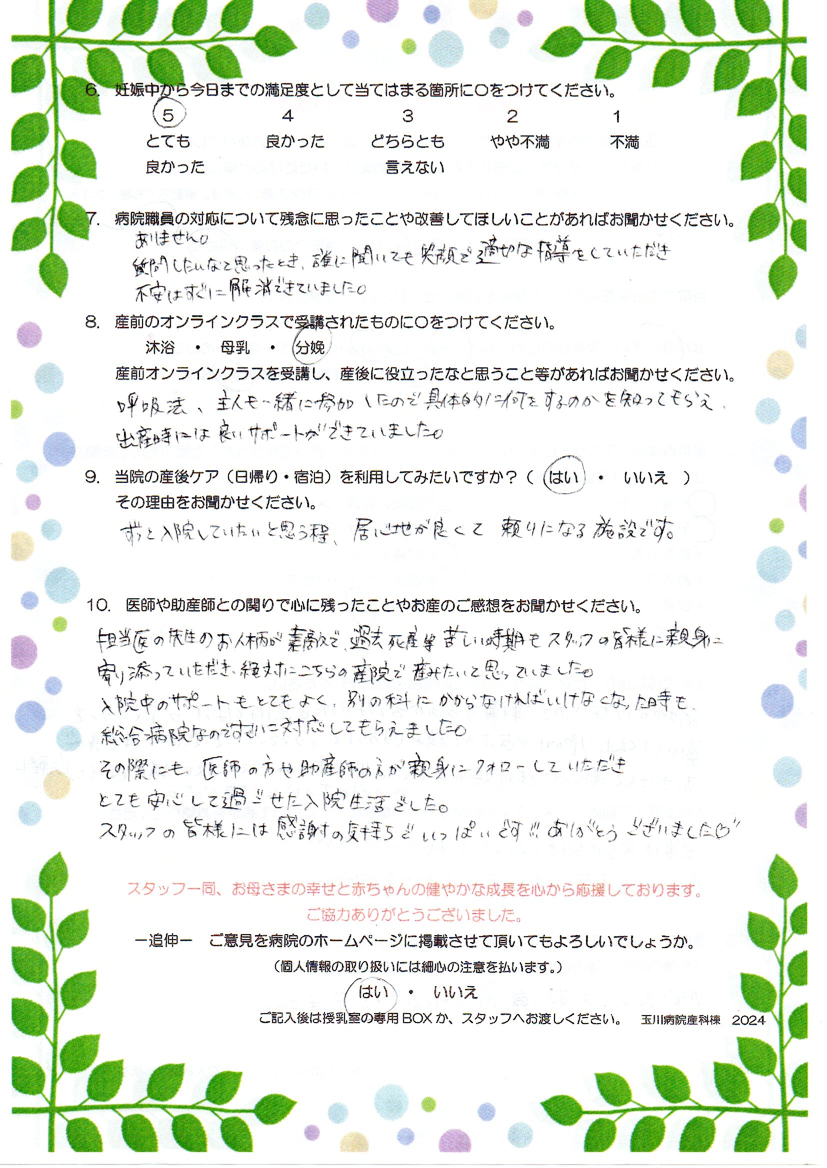 担当医の先生のお人柄が素敵で、過去死産等苦しい時期もスタッフの皆様に親身に寄り添っていただき、絶対にこちらの産院で産みたいと思っていました。入院中のサポートもとてもよく、別の科にかからなければいけなくなった時も、総合病院なのですぐに対応してもらえました。その際にも、医師の方や助産師の方が親身にフォローしていただきとても安心して過ごせた入院生活でした。スタッフの皆様には感謝の気持ちでいっぱいです!!! ありがとうございました♡