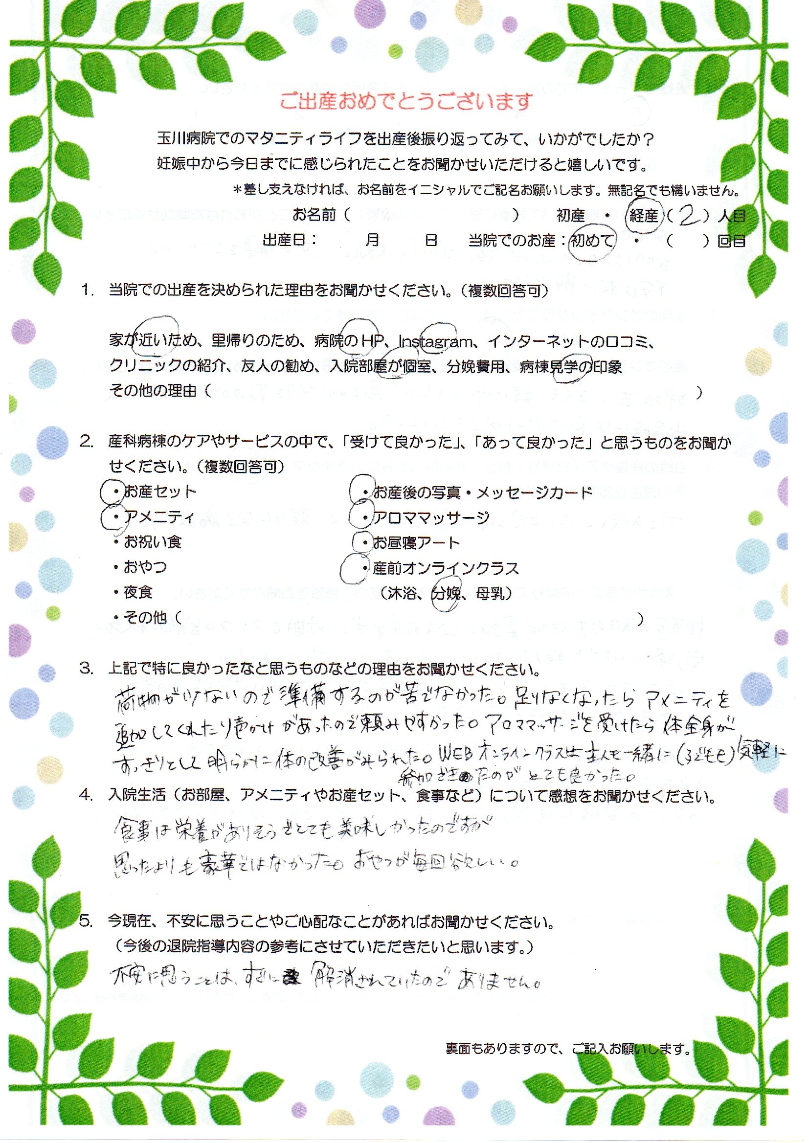 担当医の先生のお人柄が素敵で、過去死産等苦しい時期もスタッフの皆様に親身に寄り添っていただき、絶対にこちらの産院で産みたいと思っていました。入院中のサポートもとてもよく、別の科にかからなければいけなくなった時も、総合病院なのですぐに対応してもらえました。その際にも、医師の方や助産師の方が親身にフォローしていただきとても安心して過ごせた入院生活でした。スタッフの皆様には感謝の気持ちでいっぱいです!!! ありがとうございました♡