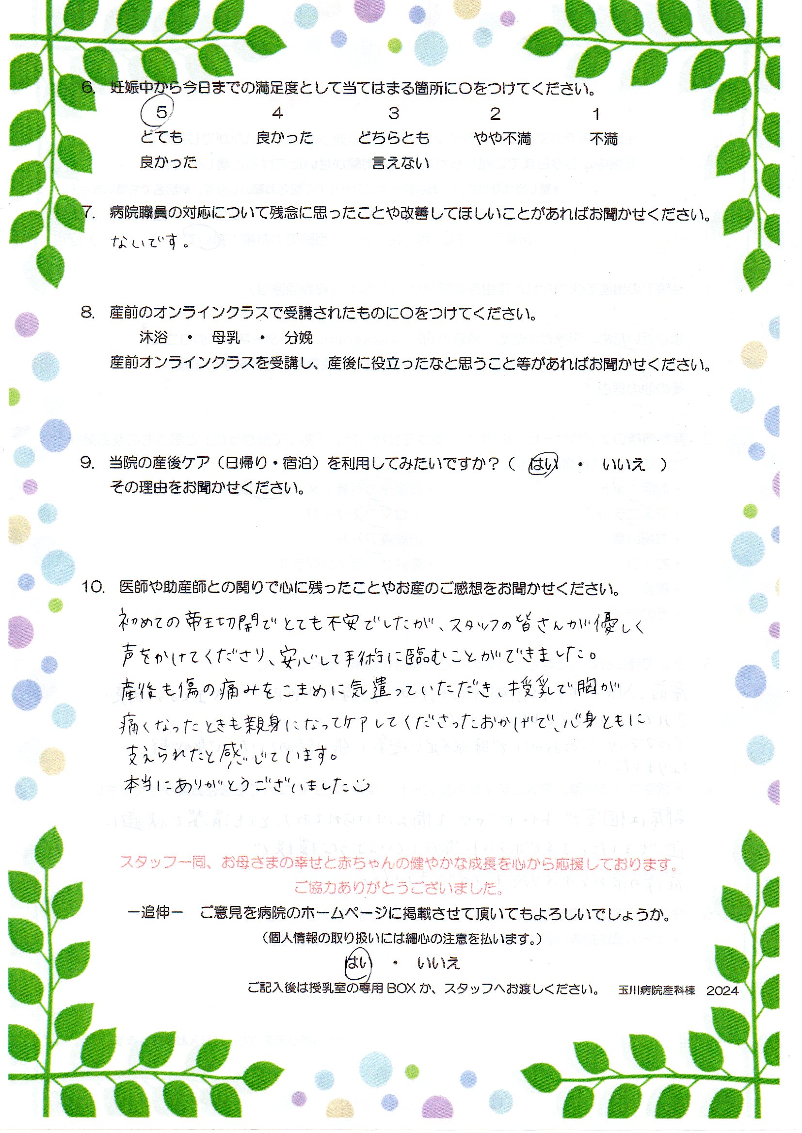 初めての帝王切開でとても不安でしたが、スタッフの皆さんが優しく声をかけてくださり、安心して手術に臨むことができました。産後も傷の痛みをこまめに気遣っていただき、授乳で胸が痛くなったときも親身になってケアしてくださったおかげで、心身ともに支えられたと感じています。本当にありがとうございました☺