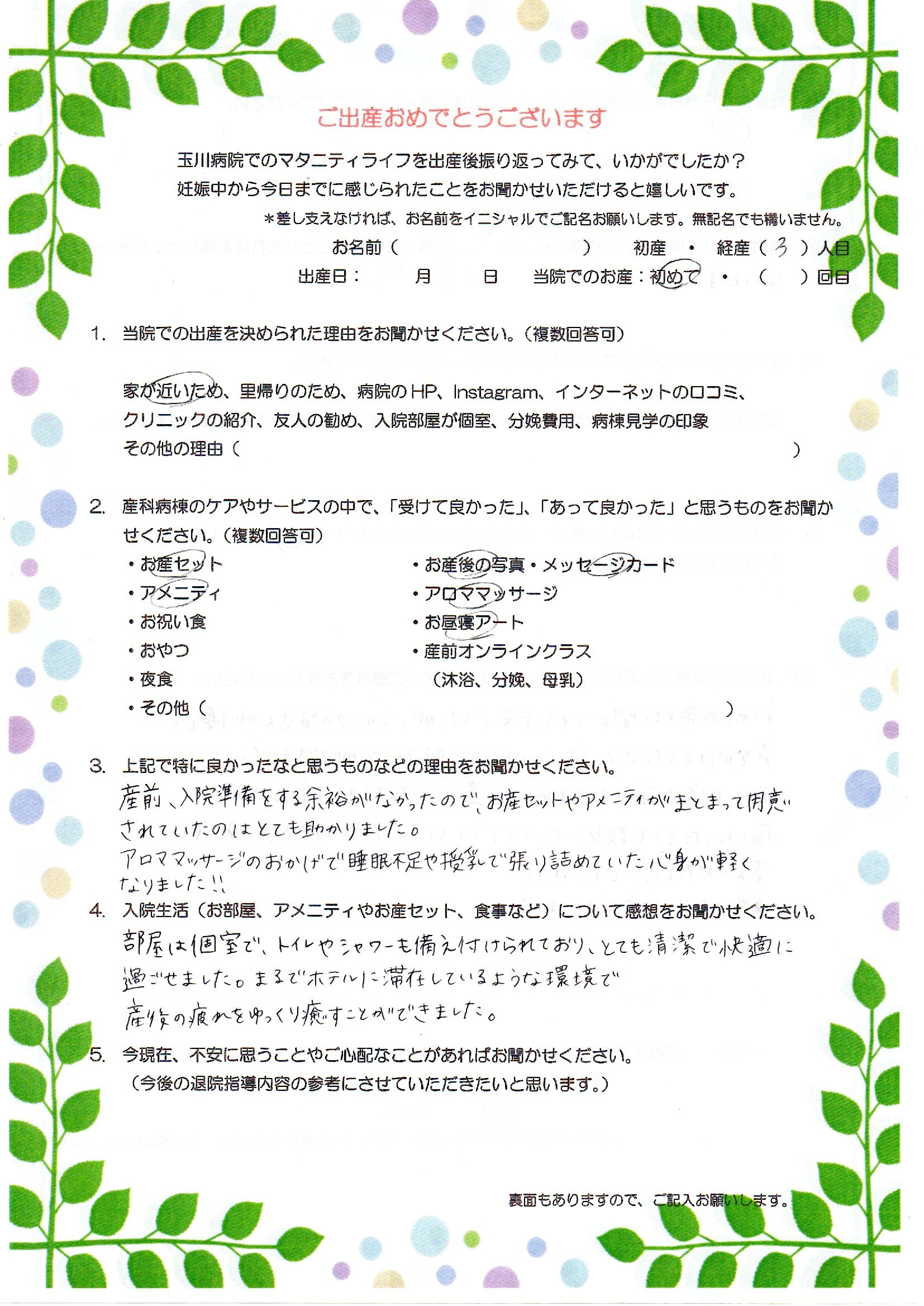 初めての帝王切開でとても不安でしたが、スタッフの皆さんが優しく声をかけてくださり、安心して手術に臨むことができました。産後も傷の痛みをこまめに気遣っていただき、授乳で胸が痛くなったときも親身になってケアしてくださったおかげで、心身ともに支えられたと感じています。本当にありがとうございました☺