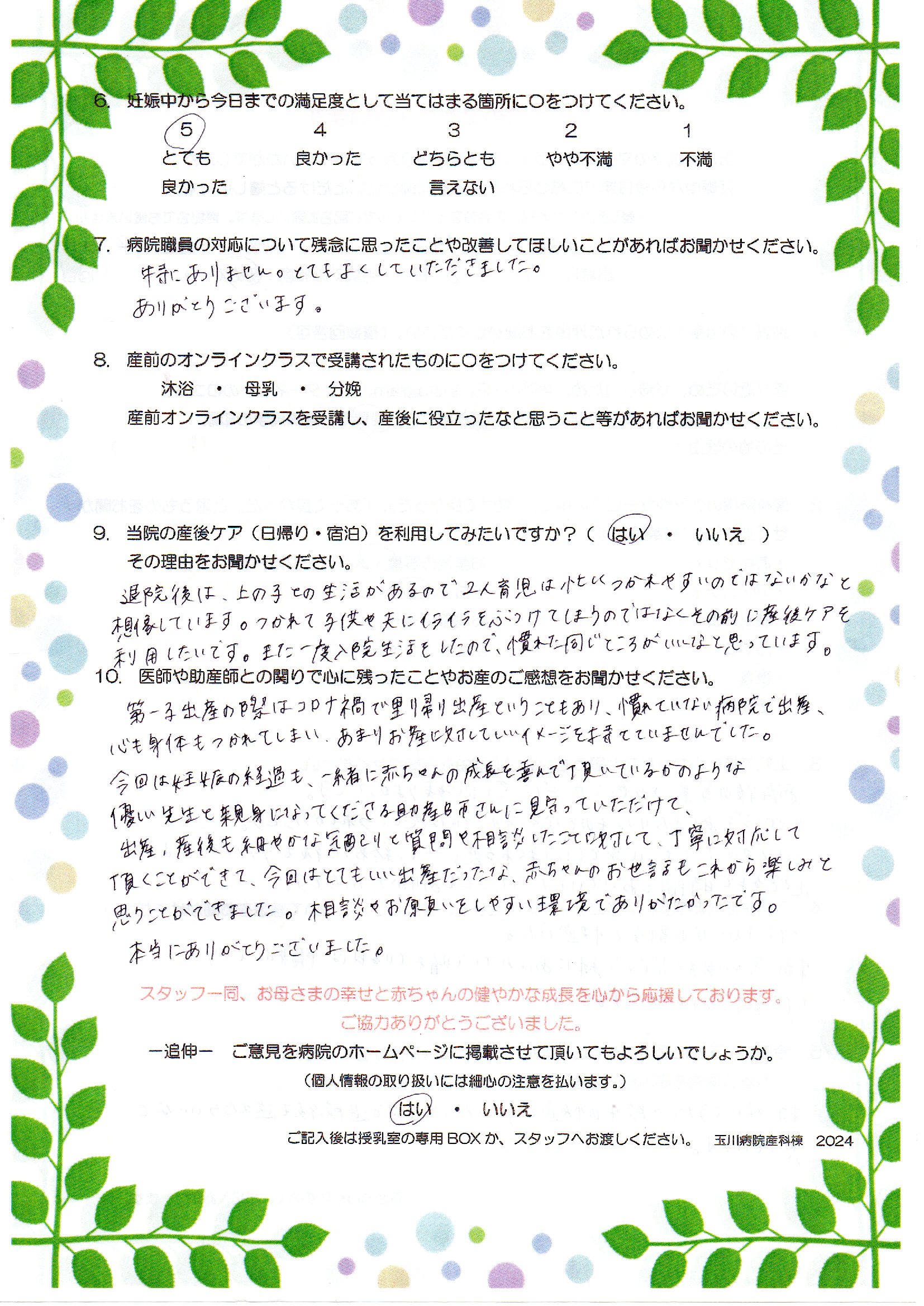 第一子出産の際はコロナ禍で里帰り出産ということもあり、慣れていない病院で出産、心も身体もつかれてしまい、あまりお産に対していいイメージを持てていませんでした。今回は妊娠の経過も、一緒に赤ちゃんの成長を喜んで頂いているかのような優しい先生と親身になってくださる助産師さんに見守っていただけて、出産、産後も細やかな気配りと質問や相談したことに対して、丁寧に対応して頂くことができて、今回はとてもいい出産だったな、赤ちゃんのお世話もこれから楽しみと思うことができました。相談やお願いをしやすい環境でありがたかったです。本当にありがとうございました。