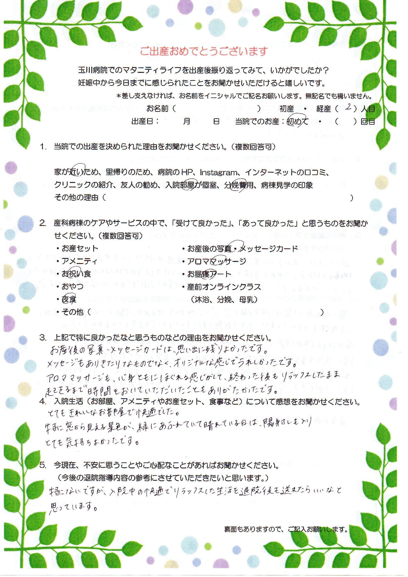 第一子出産の際はコロナ禍で里帰り出産ということもあり、慣れていない病院で出産、心も身体もつかれてしまい、あまりお産に対していいイメージを持てていませんでした。今回は妊娠の経過も、一緒に赤ちゃんの成長を喜んで頂いているかのような優しい先生と親身になってくださる助産師さんに見守っていただけて、出産、産後も細やかな気配りと質問や相談したことに対して、丁寧に対応して頂くことができて、今回はとてもいい出産だったな、赤ちゃんのお世話もこれから楽しみと思うことができました。相談やお願いをしやすい環境でありがたかったです。本当にありがとうございました。