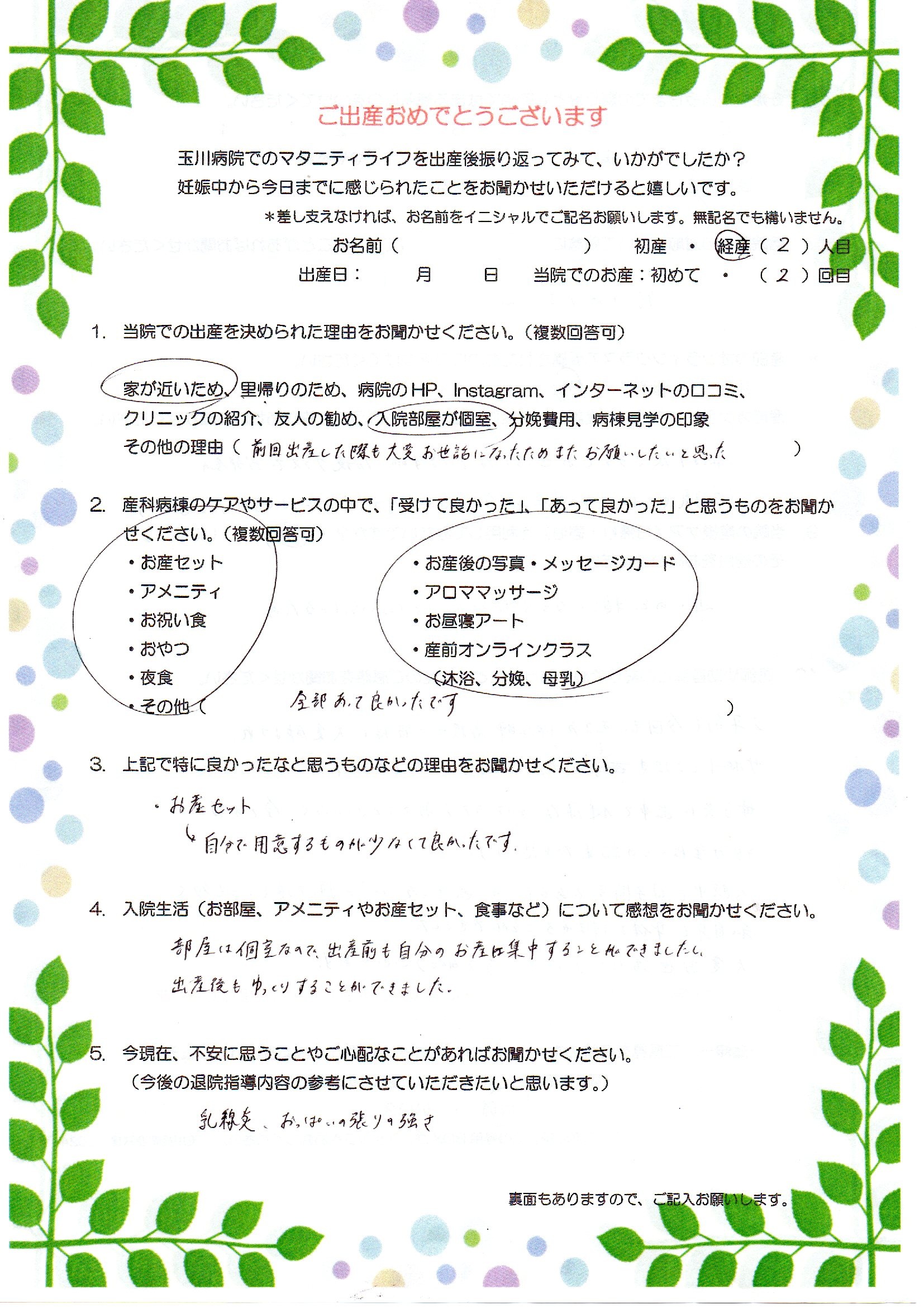 2年前も今回も、先生方、助産師・看護士の皆様に大変励まされ、サポートして頂き安心して出産に臨むことができました。母子共に無事で健康なことは当たり前のことではなく、全ての努力と積み重ねからの結果だと思います。入院中も母子同室であるものの、”無理しないで”と預かって頂くことも多く、私自身も身体を休ませることができました。大変お世話になりました。ありがとうございます。