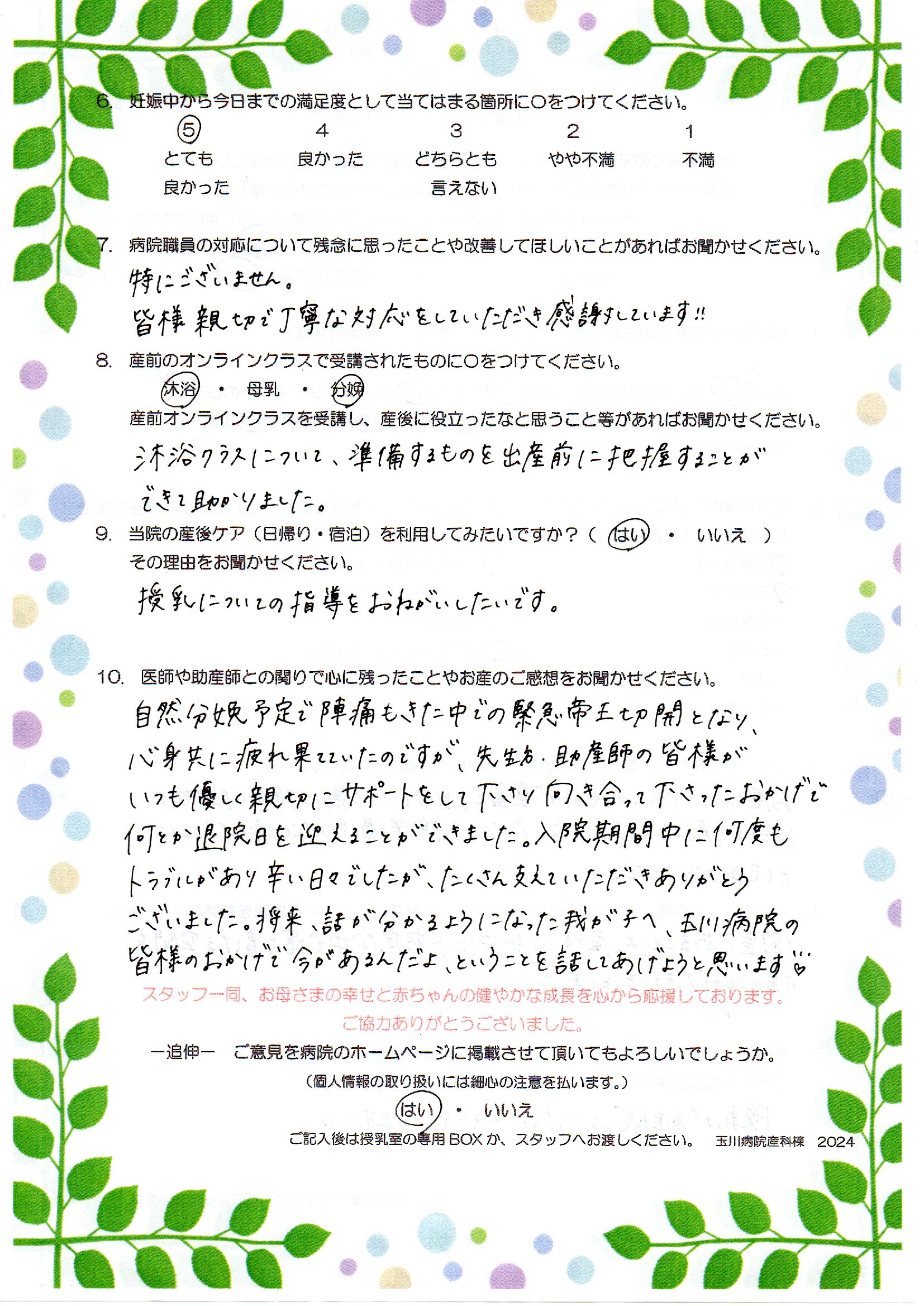 自然分娩予定で陣痛もきた中での緊急帝王切開となり、心身共に疲れ果てていたのですが、先生方・助産師の皆様がいつも優しく親切にサポートをして下さり向き合って下さったおかげで何とか退院日を迎えることができました。入院期間中に何度もトラブルがあり辛い日々でしたが、たくさん支えていただきありがとうございました。将来、話が分かるようになった我が子へ、玉川病院の皆様のおかげで今があるんだよ、ということを話してあげようと思います♡