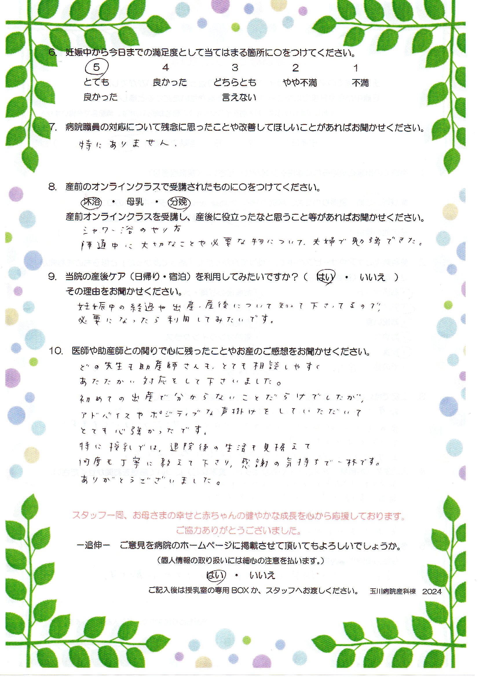 どの先生も助産師さんも、とても相談しやすくあたたかい対応をして下さいました。初めての出産で分からないことだらけでしたが、アドバイスやポジティブな声掛けをしていただいてとても心強かったです。特に授乳では、退院後の生活も見据えて何度も丁寧に教えて下さり、感謝の気持ちで一杯です。ありがとうございました。