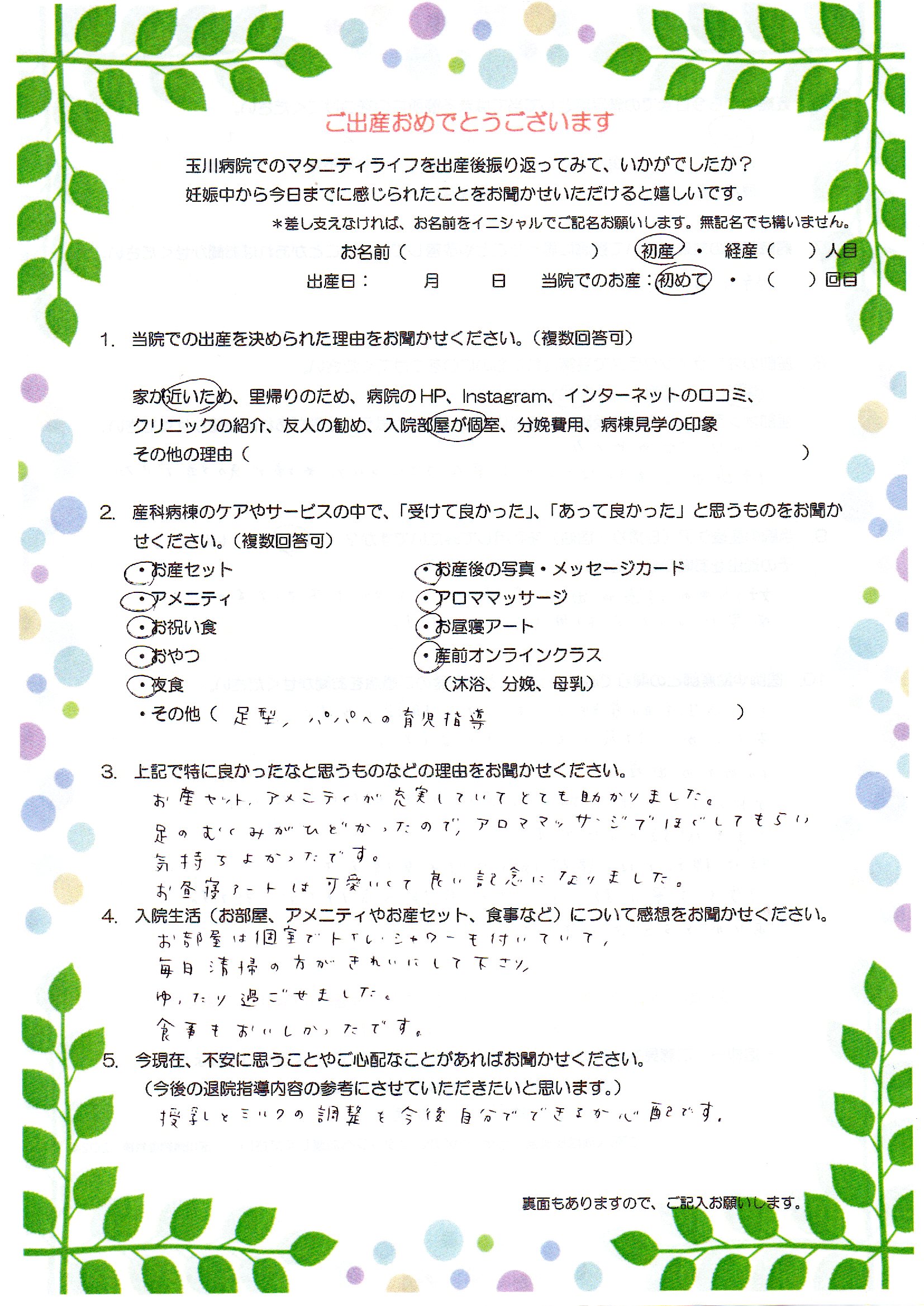どの先生も助産師さんも、とても相談しやすくあたたかい対応をして下さいました。初めての出産で分からないことだらけでしたが、アドバイスやポジティブな声掛けをしていただいてとても心強かったです。特に授乳では、退院後の生活も見据えて何度も丁寧に教えて下さり、感謝の気持ちで一杯です。ありがとうございました。