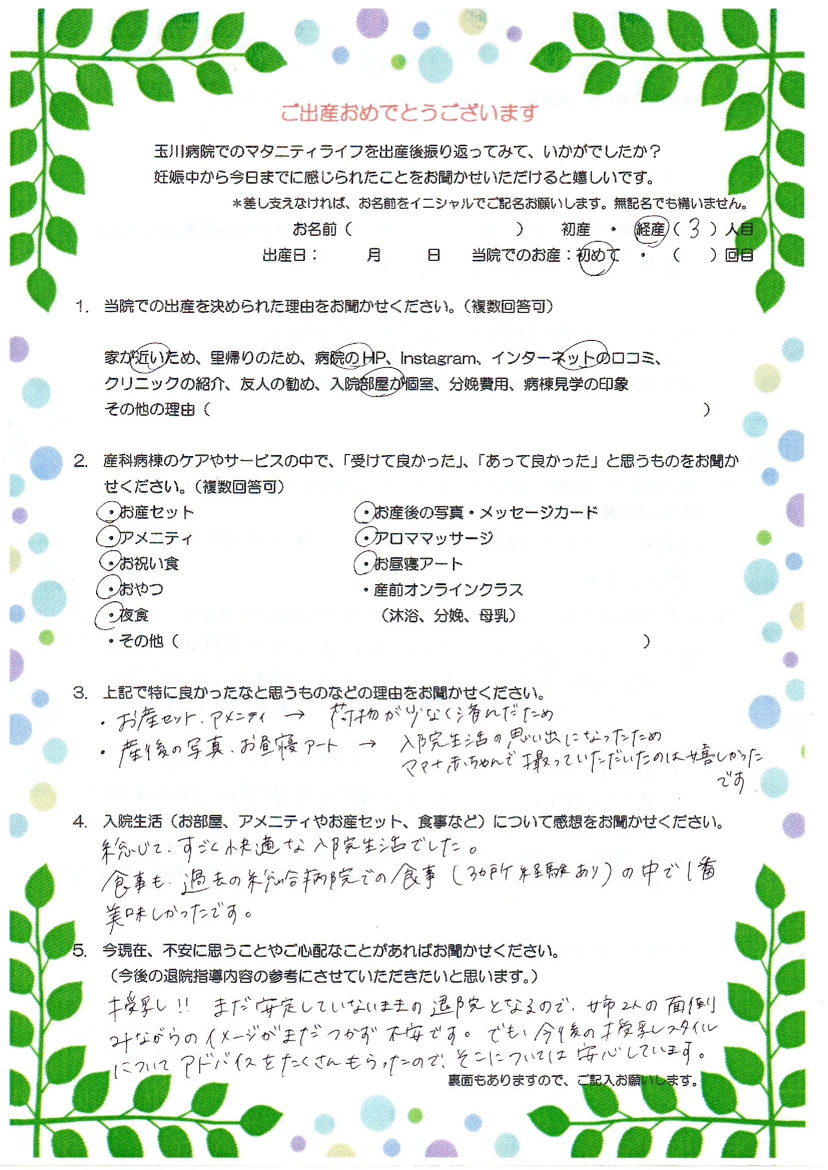 ・関わって下さった方が皆親切で、多くの助産師さんのアドバイスをいただけた(授乳の方法・痛い時の対処法など)ことが、良かったです。