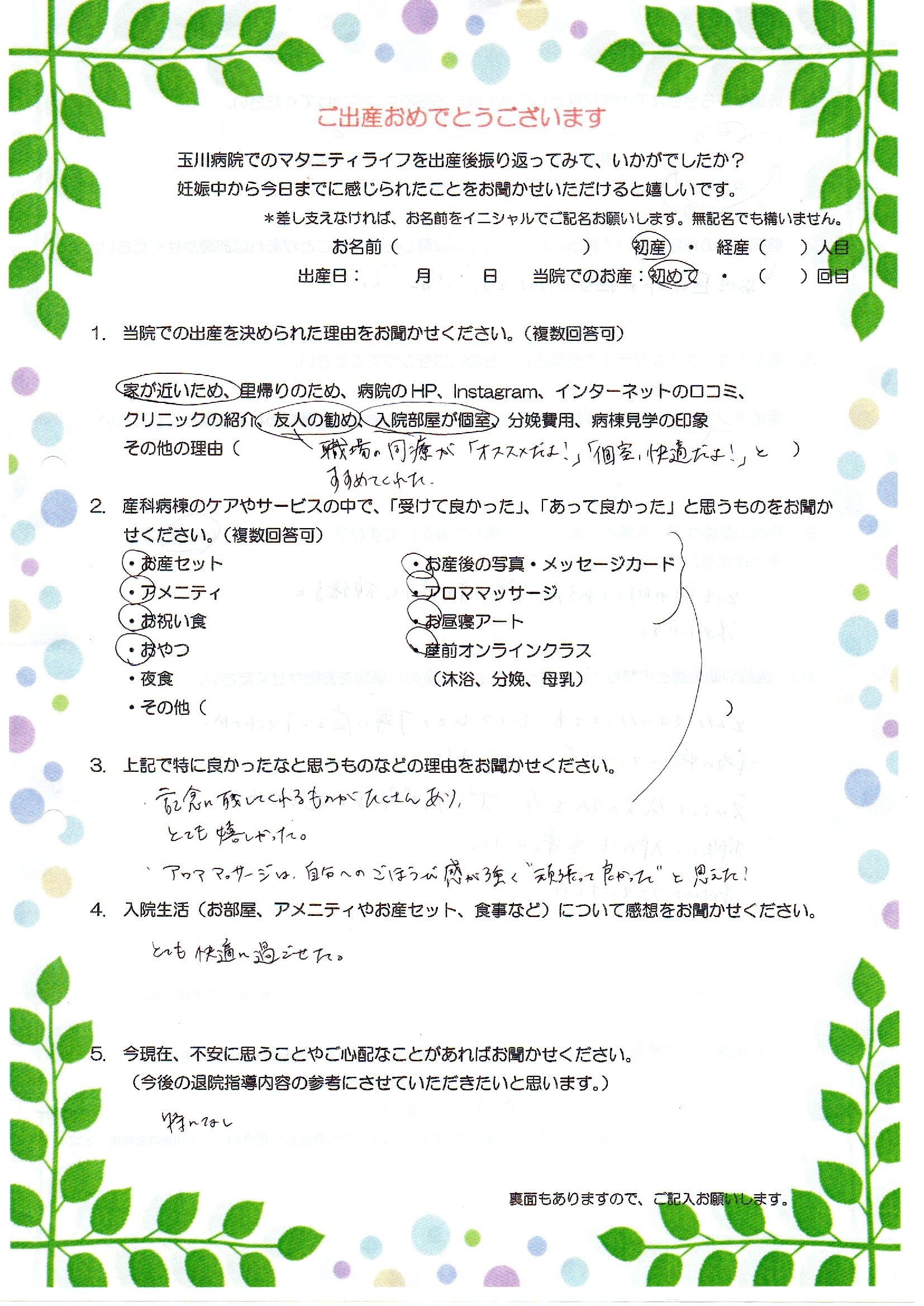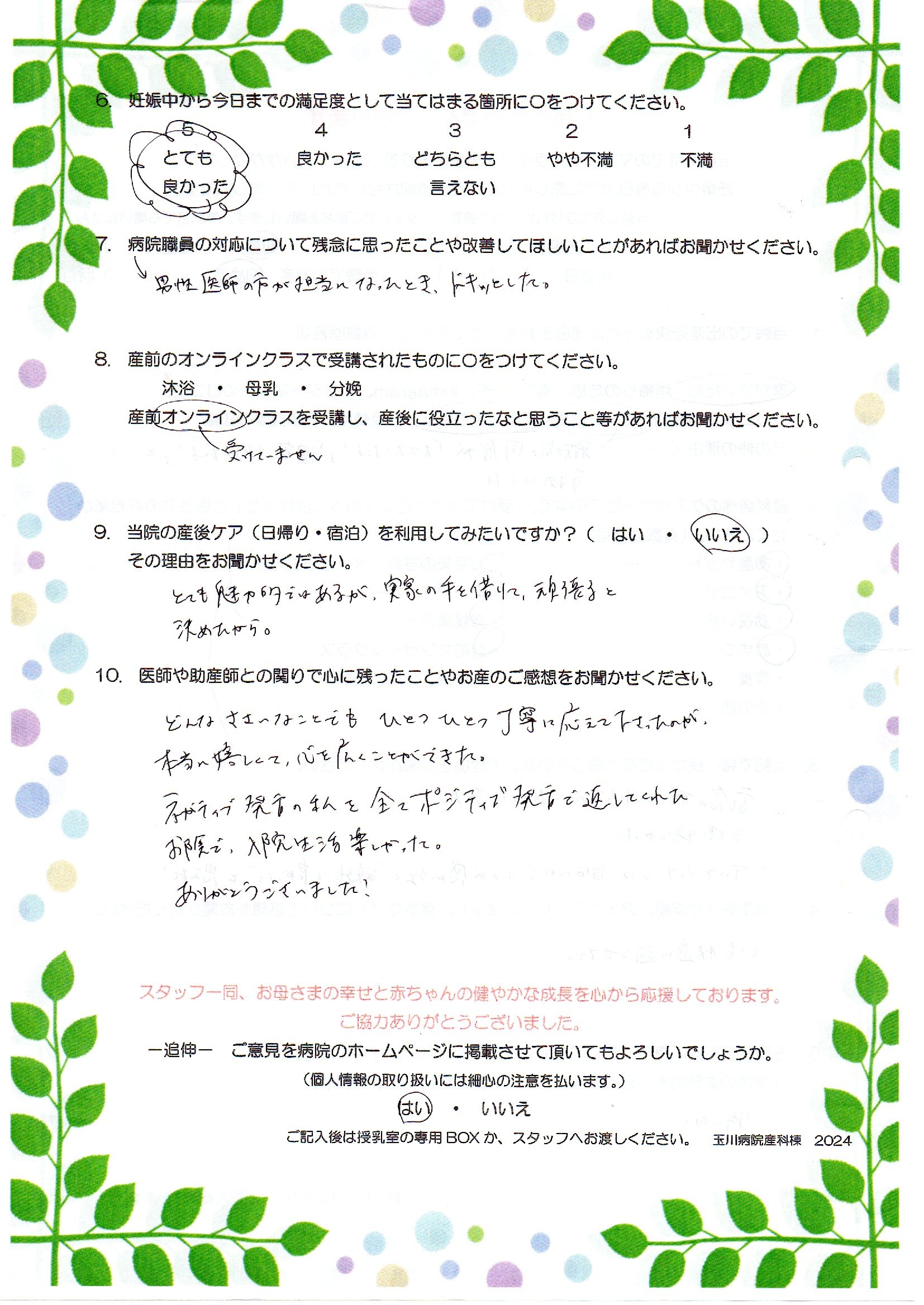 どんなささいなことでもひとつひとつ丁寧に応えて下さったのが、本当に嬉しくて、心を広くことができた。ネガティブ発言の私を全てポジティブ発言で返してくれたお陰で、入院生活楽しかった。ありがとうございました!