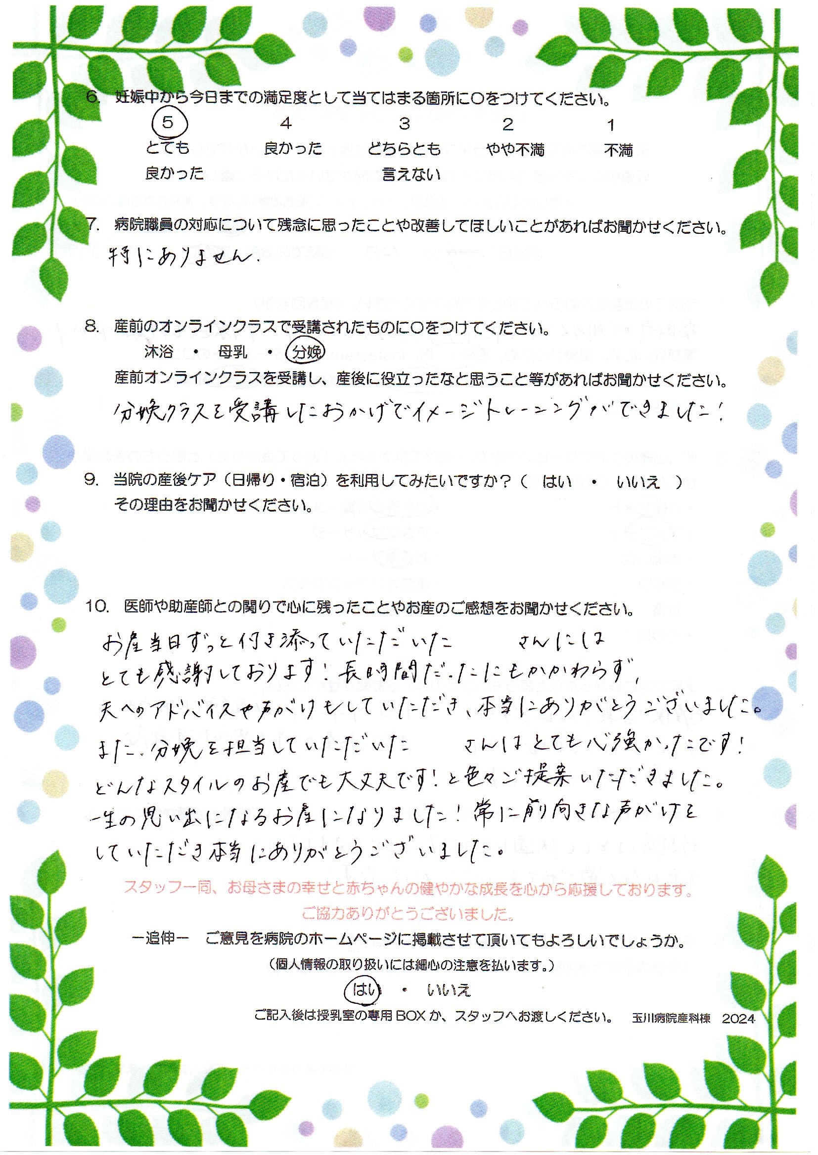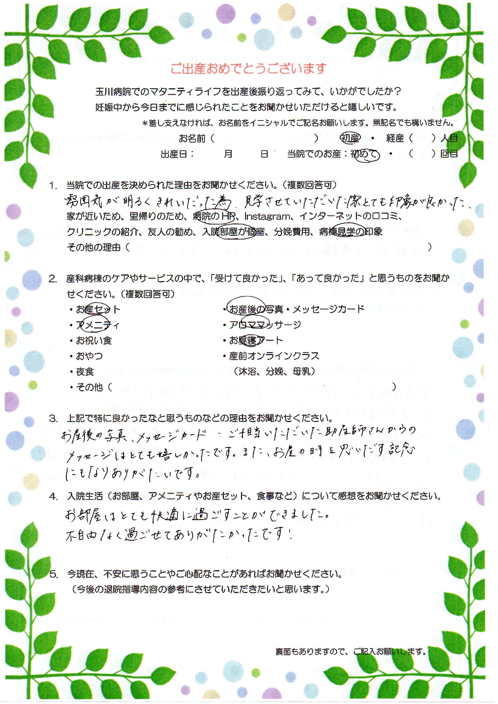 お産当日ずっと付き添っていただいた○○さんにはとても感謝しております!長時間だったにもかかわらず、夫へのアドバイスや声がけもしていただき、本当にありがとうございました。また、分娩を担当していただいた○○さんはとても心強かったです!どんなスタイルのお産でも大丈夫です!と色々ご提案いただきました。一生の思い出になるお産になりました!常に前向きな声がけをしていただき本当にありがとうございました。