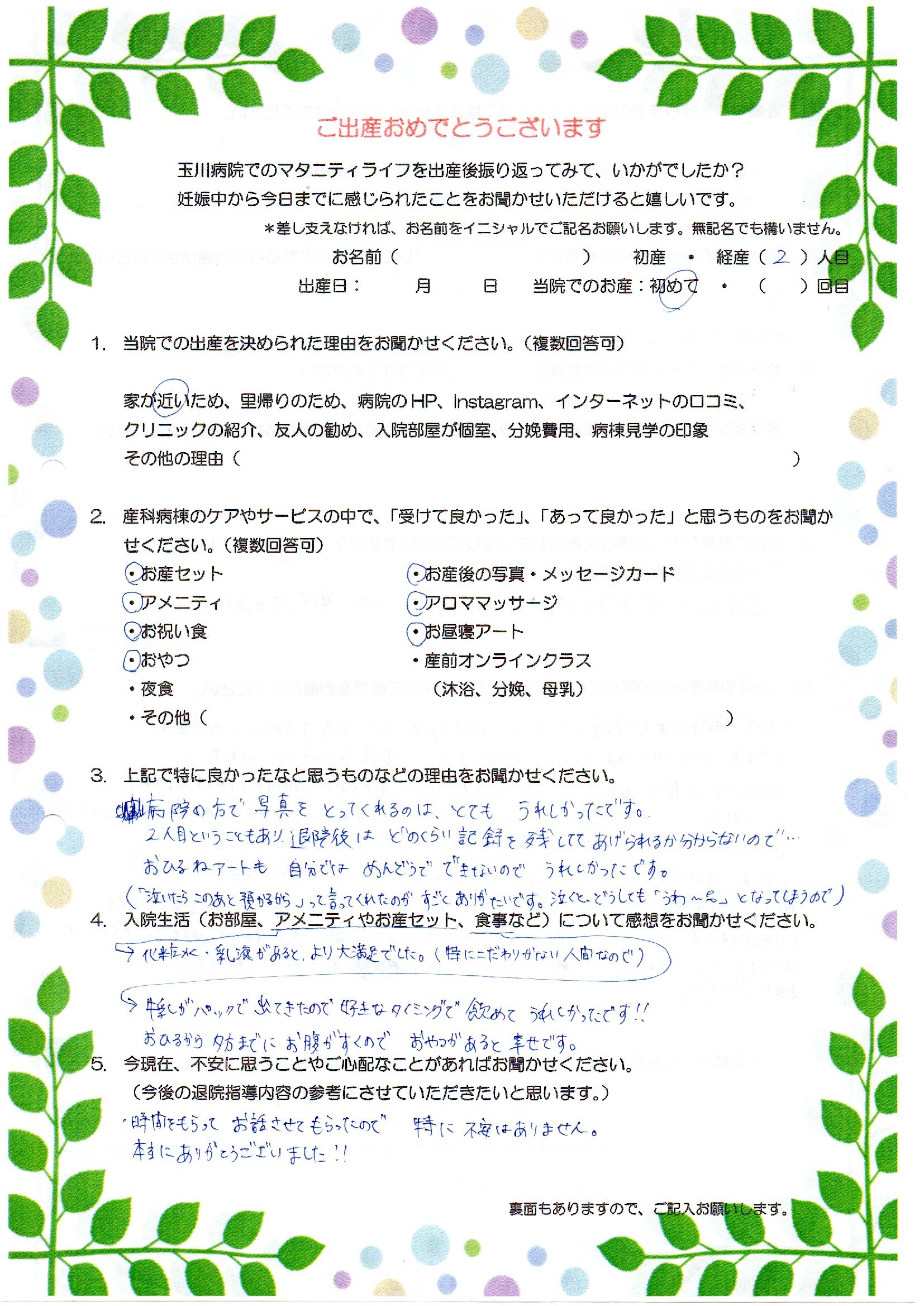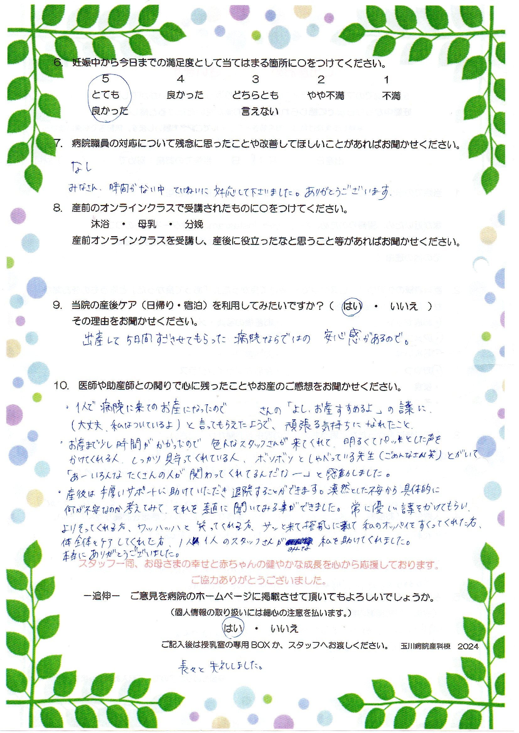 ・産後は手厚いサポートに助けていただき退院することができます。漠然とした不安から具体的に何が不安なのか考えてみて、それを素直に聞いてみる事ができました。常に優しい言葉をかけてもらい、よりそってくれる方、ワッハッハと笑ってくれる方、サッと来て搾乳にして私のおっぱいをすくってくれた方、体全体をケアしてくれた方、1人1人のスタッフさんがみんな私を助けてくれました。本当にありがとうございました。