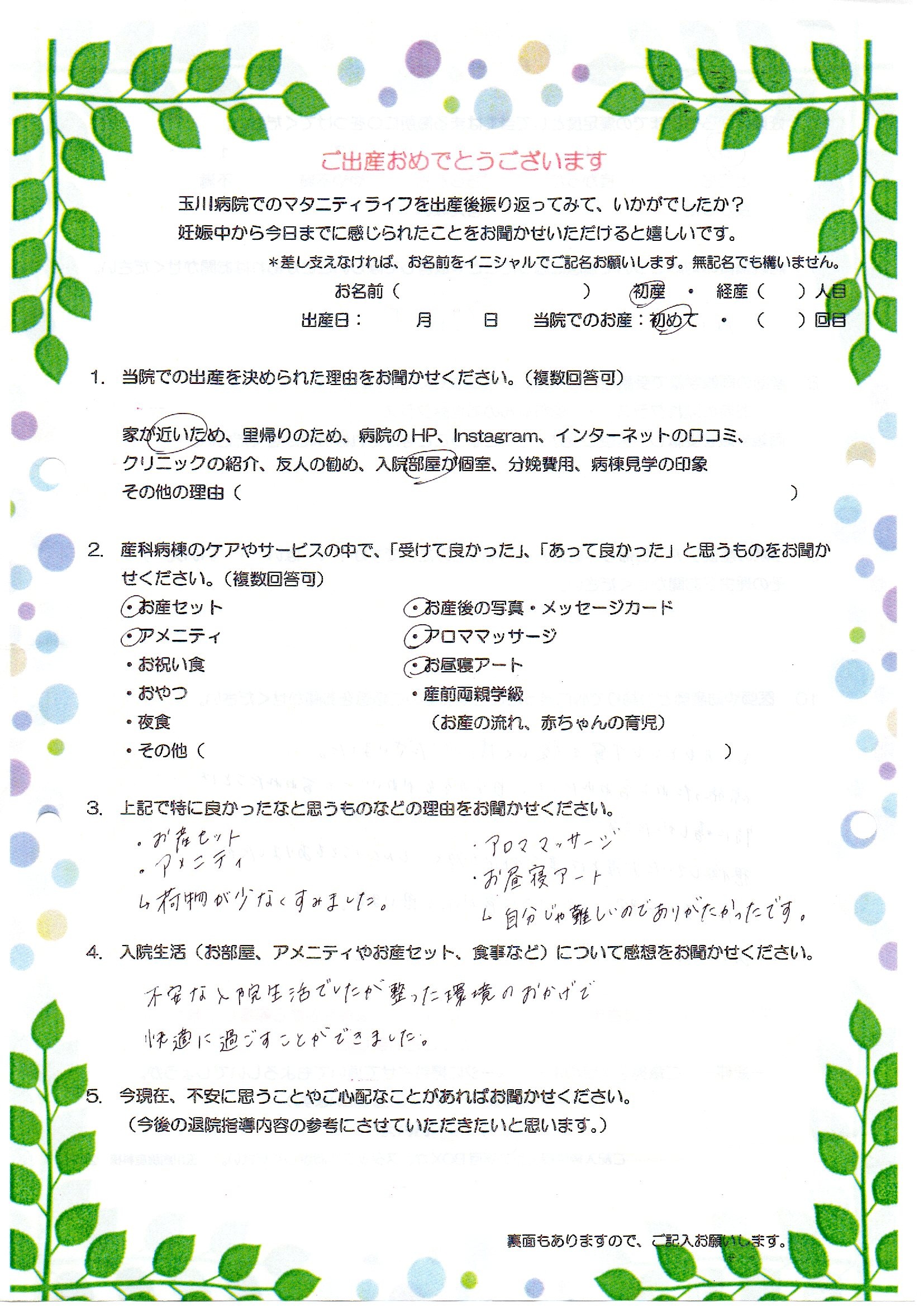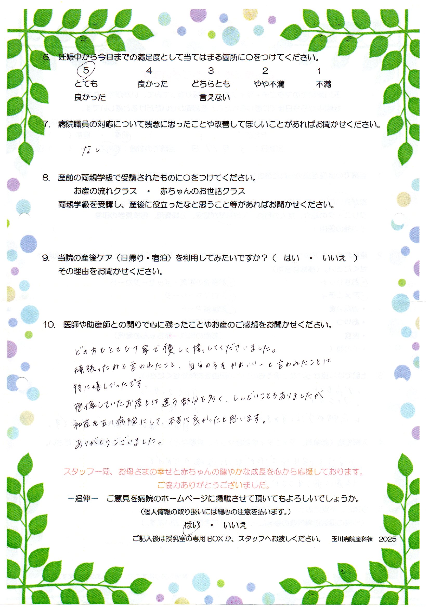 どの方もとても丁寧で優しく接っしてくださいました。頑張ったねと言われたこと、自分の子をかわいいーと言われたことは特に嬉しかったです。想像していたお産とは違う部分も多く、しんどいこともありましたが初産を玉川病院にして、本当に良かったと思います。ありがとうございました。