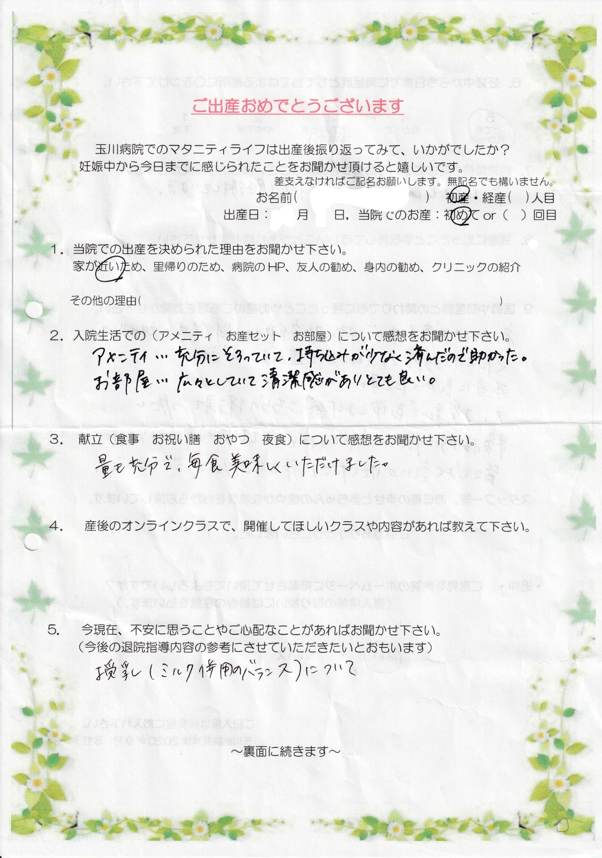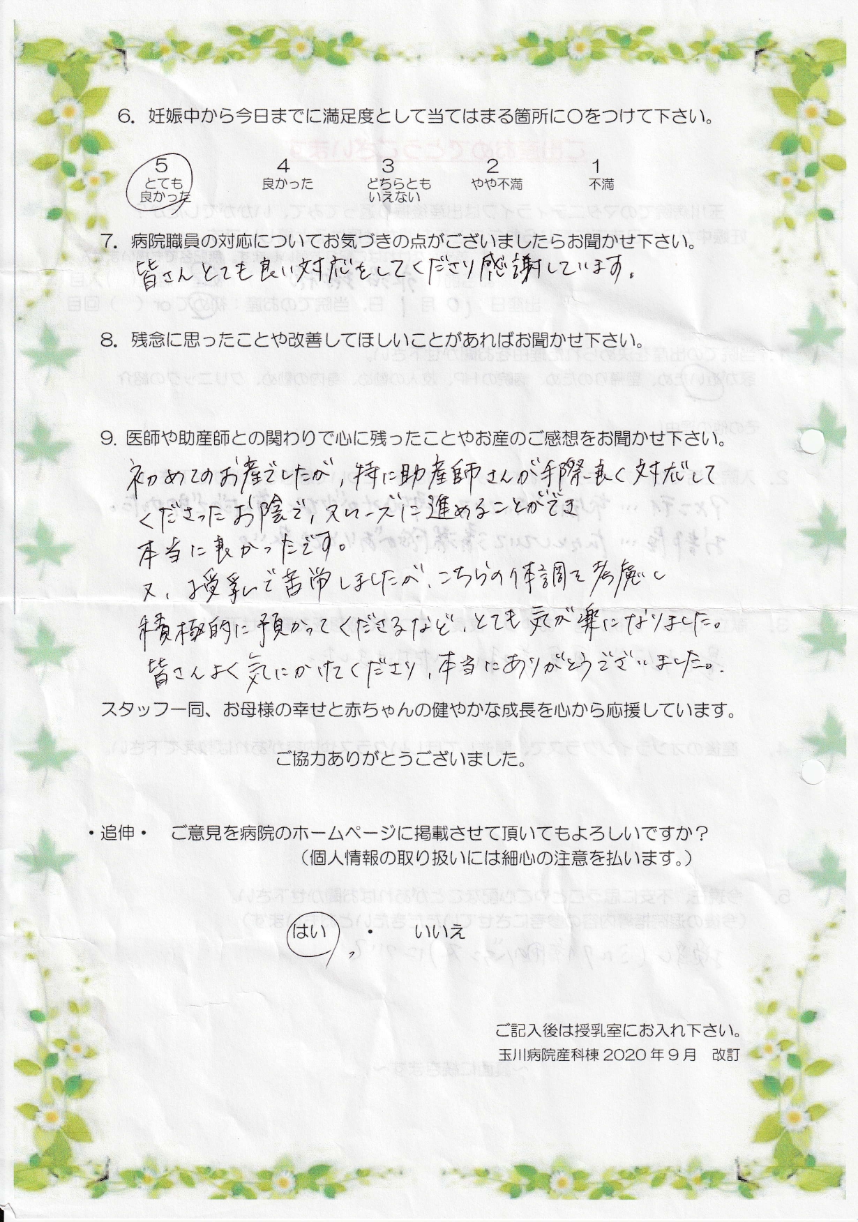 【9】初めてのお産でしたが、特に助産師さんが手際良く対応してくださったお陰で、スムーズに進めることができ本当によかったです。又、授乳で苦労しましたが、こちらの体調を考慮し積極的に預かってくださるなど、とても気が楽になりました。皆さんよく気にかけてくださり、本当にありがとうございました。