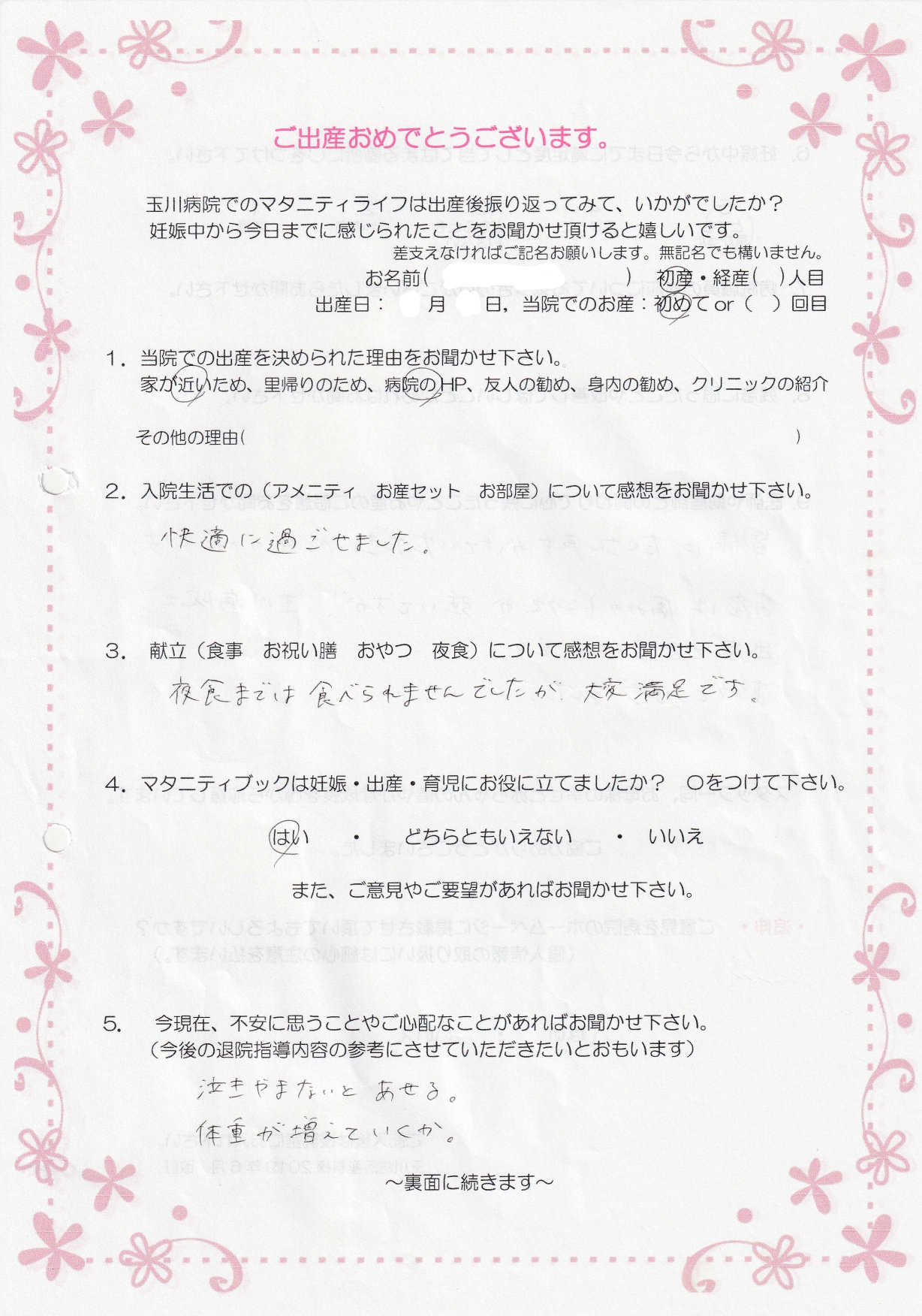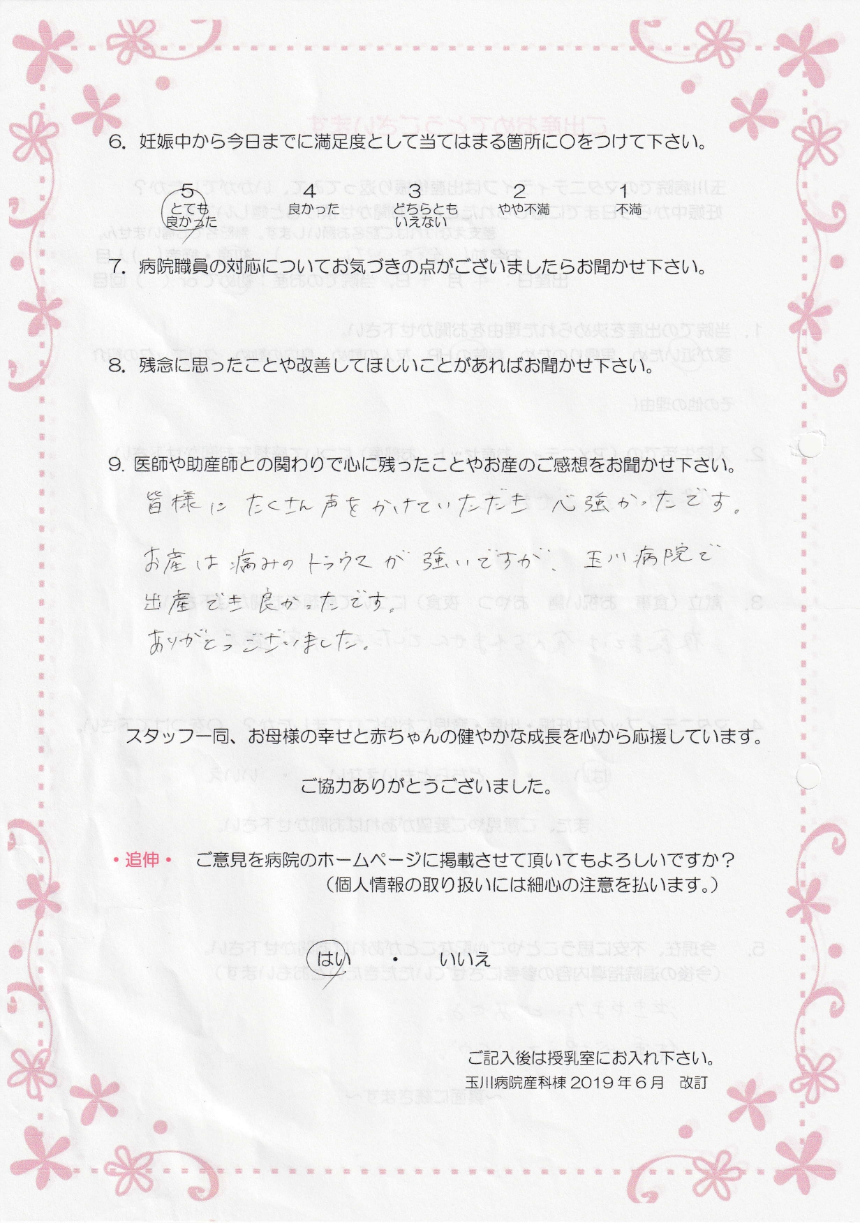 【9】 皆様にたくさん声をかけていただき心強かったです。お産は痛みのトラウマが強いですが、玉川病院で出産でき良かったです。ありがとうございました。